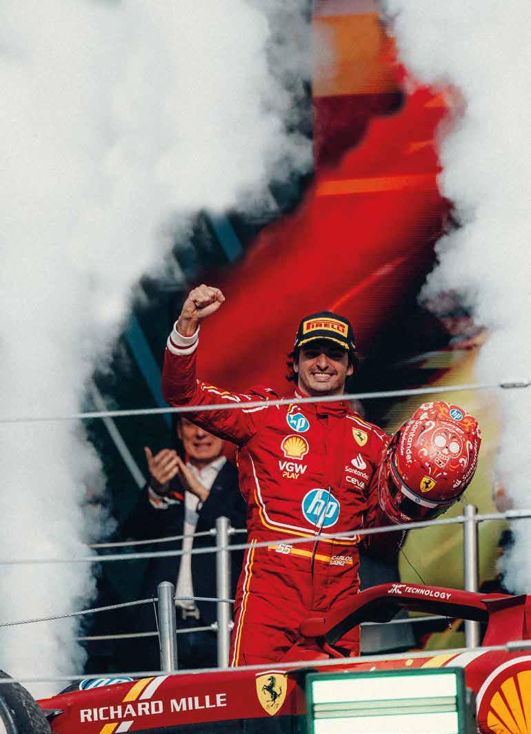 Su profesionalidad, compromiso y dedicación convencieron a la dirección del Cavallino Rampante para donar un monoplaza con un simbolismo especial para Carlos, que hasta aquella carrera en Silverstone 2022 había logrado podios, pero nunca había subido al escalón más alto.