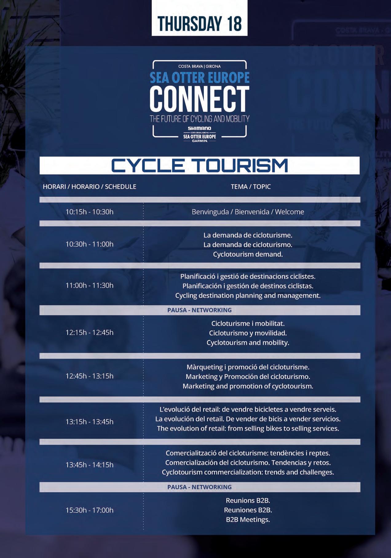 Una vegada consolidat com a espai de debat i networking, Sea Otter Connect torna enguany amb dues jornades dedicades als professionals de la indústria de la bicicleta. Amb les entrades exhaurides, el dijous 18 de setembre les sessions giraran entorn del cicloturisme, amb ponències sobre la demanda actual, la planificació de destinacions, la comercialització i les noves tendències del sector. També es parlarà de l’evolució del retail i hi haurà espais de trobada i reunions B2B.