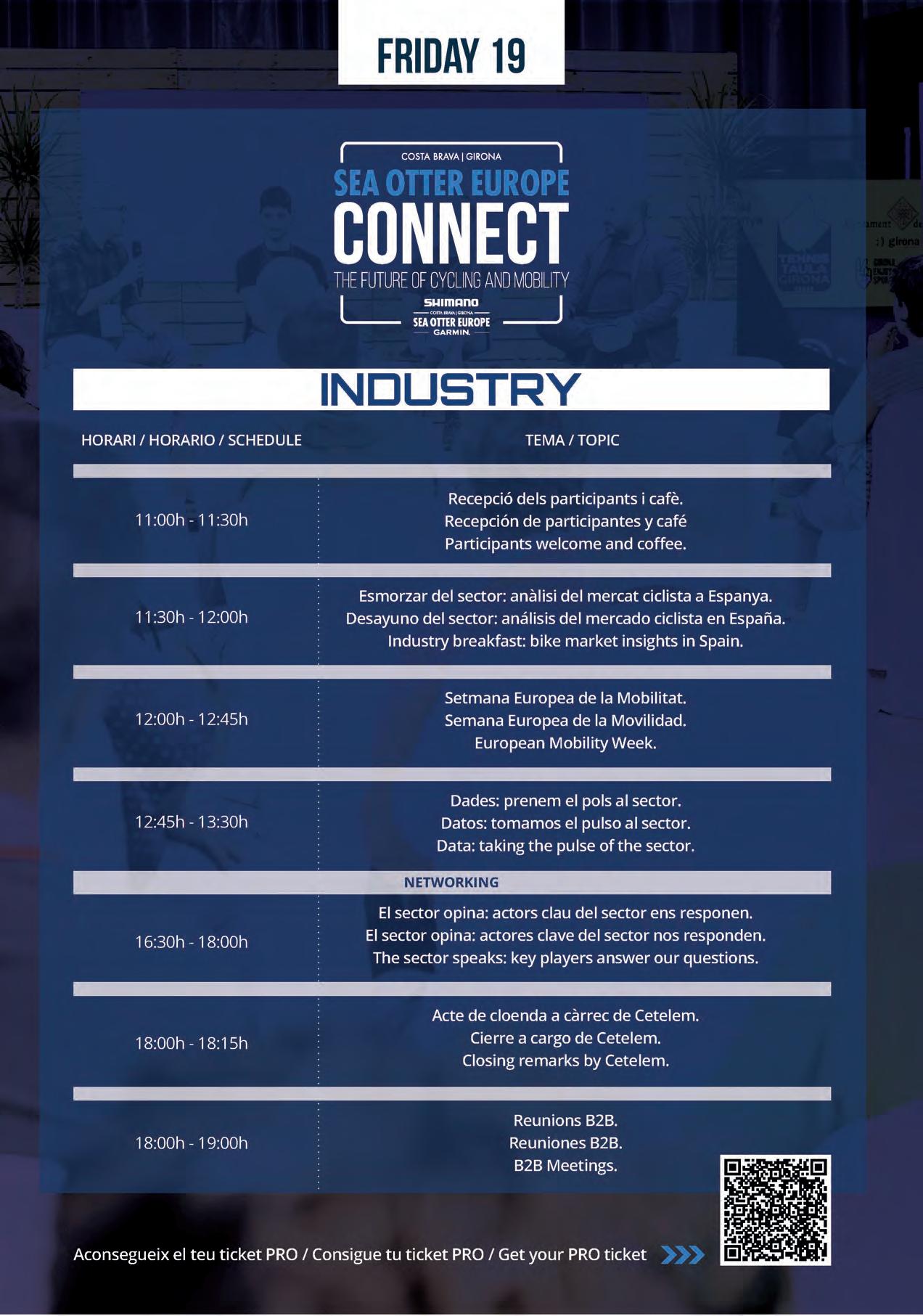 El divendres 19 de setembre la jornada arrencarà amb una trobada del sector dedicat a l’anàlisi del mercat ciclista a Espanya. Es posarà el focus en iniciatives com la Setmana Europea de la Mobilitat, es compartiran dades clau per prendre el pols al sector i s’obrirà un espai perquè els principals actors en valorin els reptes i oportunitats.