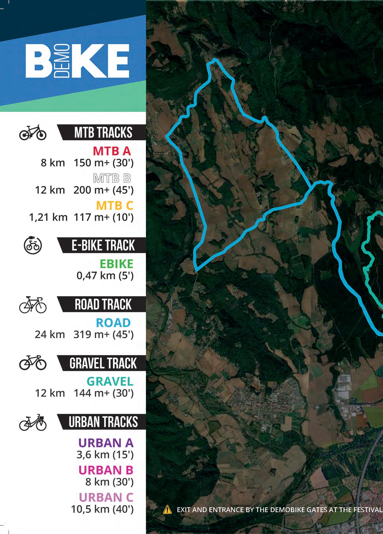 Gravel, road, MTB, E-Bike and three urban test circuits.