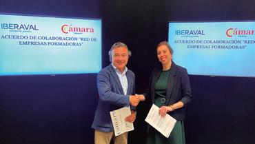 La directora de Talento y Personas de Iberaval, Cristina Cordero, y el representante de la Cámara de Comercio e Industria de Valladolid, Chema Monge, en las instalaciones de la sociedad de garantía.