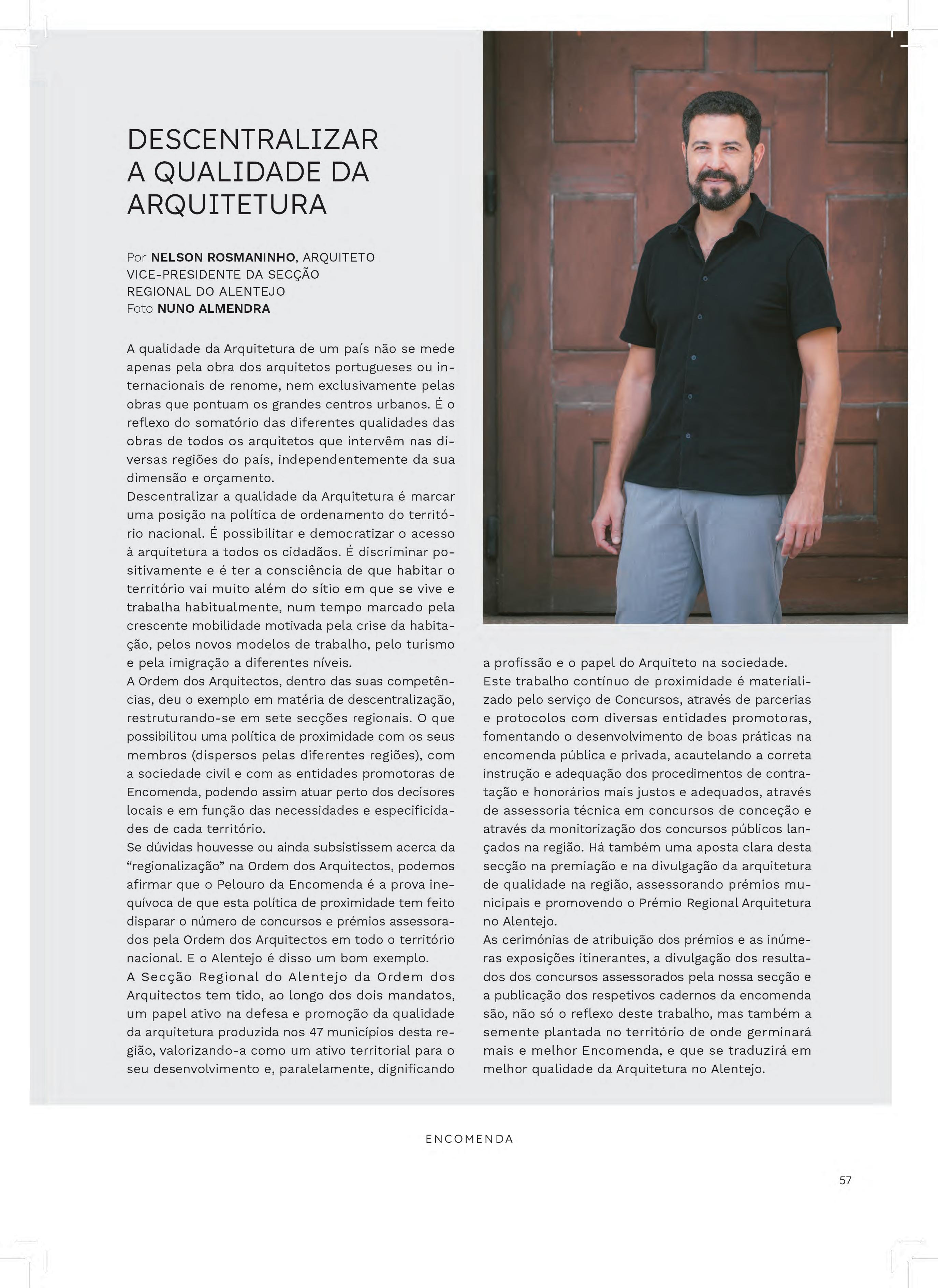 Num encontro de preparação da revista, entre membros da Secção Regional, abordou-se a questão da prática profissional na região e da própria definição do que é o Alentejo, hoje. Em uníssono, afirmou-se que “existem vários Alentejos”, incluindo aquele “Alentejo mais periférico do que o próprio Alentejo”. Foram também identificados os territórios antes e depois dos grandes programas de investimento (POLIS, PRR ou até o Portugal 2030), sublinhando a importância de avaliar o impacto destas iniciativas na agricultura, nas infraestruturas, na habitação, na educação, entre outras áreas, todas transversais à Arquitetura.
