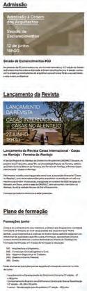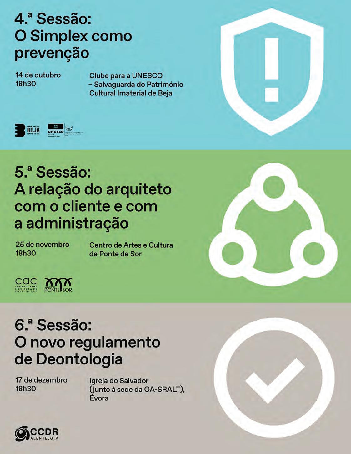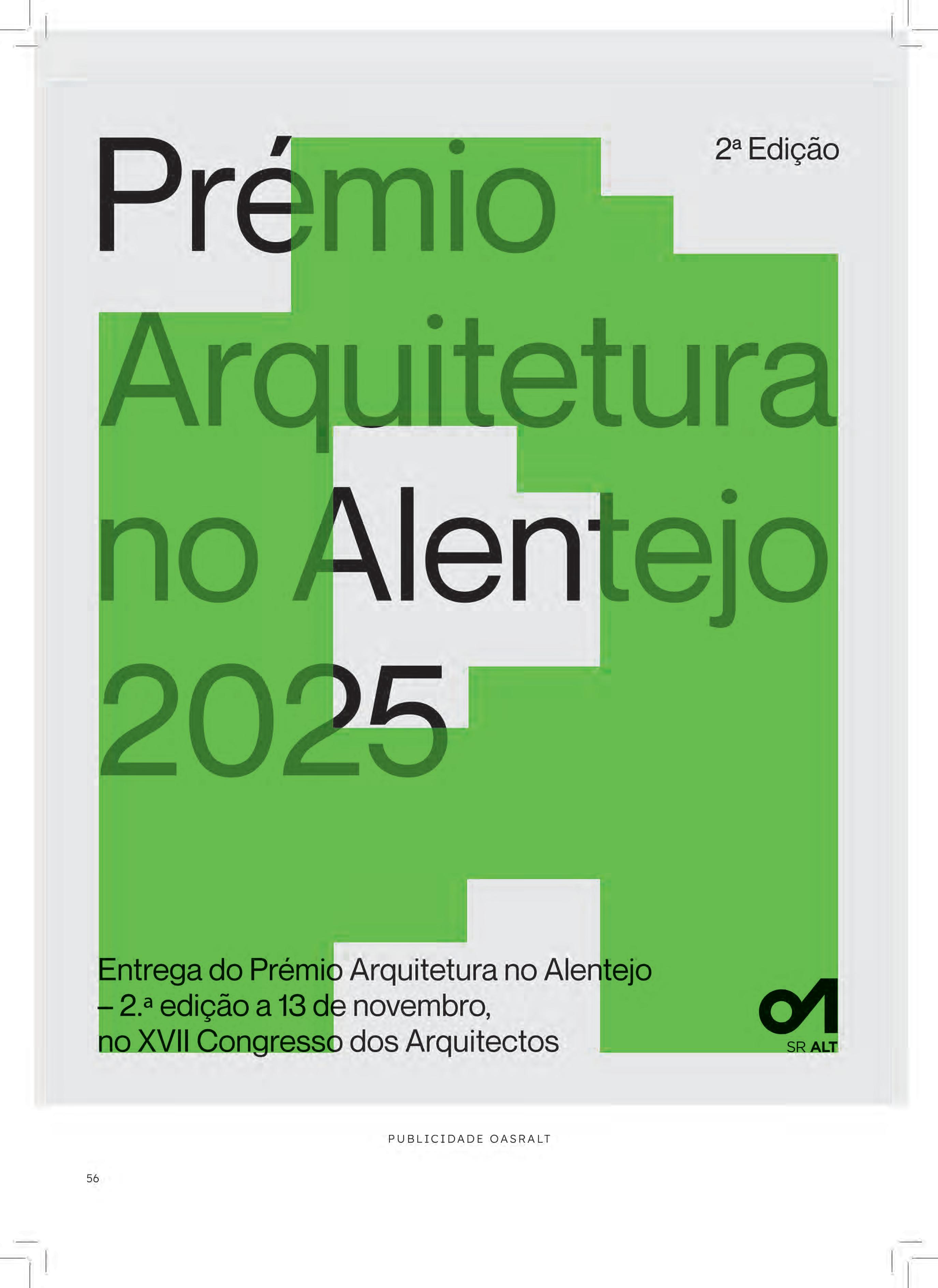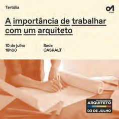 prestado pela OASRALT a diversos concursos públicos de conceção. Neste mandato deu-se ainda início às Sessões da Disciplina, orientadas para a franca discussão entre membros sobre os temas mais complexos do âmbito da disciplina profissional. Estas sessões terão continuidade em 2025, em mais três sessões descentralizadas, abrangendo temas desde a relação do arquiteto com o cliente e com a administração até ao novo regulamento de deontologia. As newsletters continuam a ser enviadas mensalmente aos membros, e reúnem toda a informação sobre as atividades da OASRALT, alterações legislativas e outras informações relevantes. No âmbito do apoio à prática profissional, foi acrescentada à newsletter uma rubrica intitulada “Sabias que?”, que mensalmente aborda questões frequentes acerca da prática profissional. Em outubro de 2025, a OASRALT edita três cadernos onde se apresentam as propostas admitidas a três concursos públicos que assessorou. Trata-se de uma forma de transparência dos procedimentos e de mostrar um conjunto de diferentes abordagens criativas ao mesmo problema. Por fim, após o lançamento no Dia Nacional do Arquiteto 2025 da 2.ª edição do Prémio Arquitetura no Alentejo, novembro verá anunciados os vencedores.