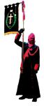 Pantalones, calcetines, zapatos, corbata y guantes de color negro y la camisa blanca. Se ciñe la túnica a la cintura con un cíngulo de seda y oro.