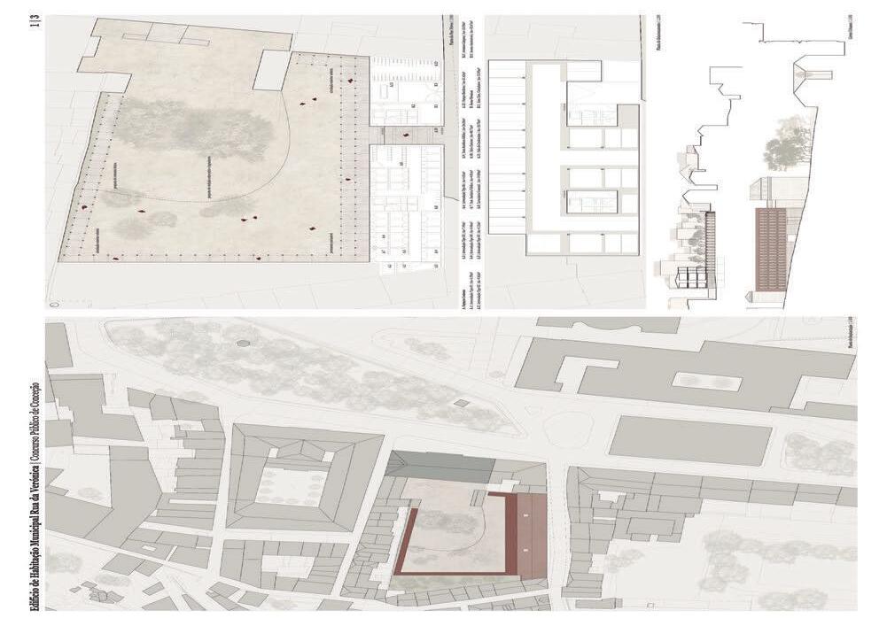 1º CLASSIFICADO: A proposta destaca-se pela notável valorização da sua integração no contexto urbano, através da interpretação do logradouro como pátio comunitário e do recurso a uma elegante partição volumétrica que permite o alargamento pontual da Rua da Verónica, anunciando simultaneamente a passagem para o logradouro. É de referir também a futura ligação proposta ao pátio do Palácio Sinel de Cordes, que se estabelece de modo fluido, na continuidade do logradouro.