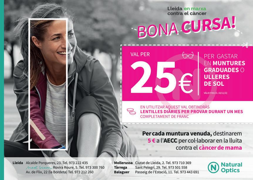 Aquesta caminada solidària organitza da per l’Associació Contra el Càncer a Lleida recaptarà fons que es destina ran a donar continuïtat a la gratuïtat dels serveis i prestacions que l’Asso ciació ofereix a persones amb càncer i els seus familiars, així com, finançar projectes de recerca.