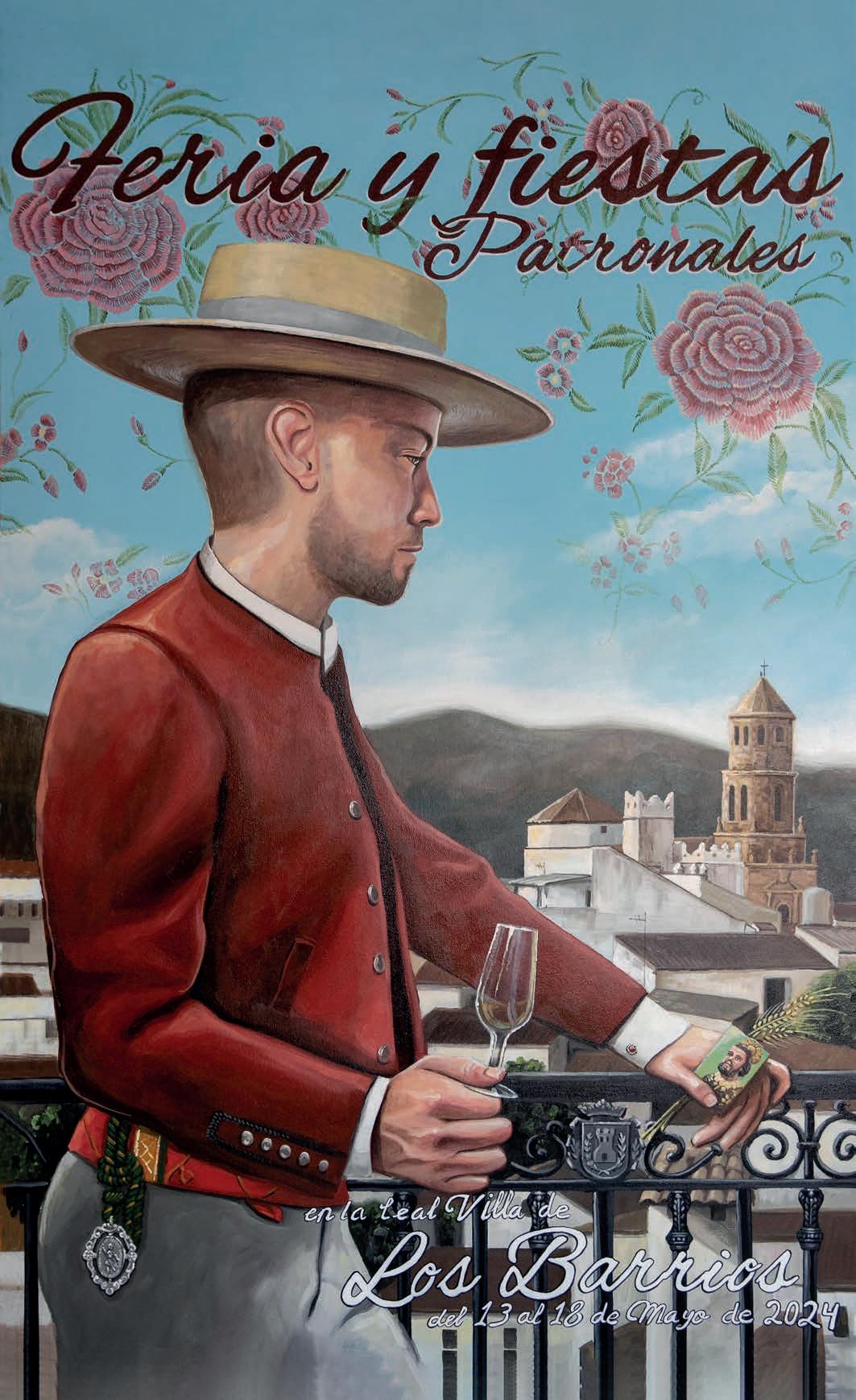 El Cartel de la feria de Los Barrios 2024 viene a romper con el estereotipo de cartel de feria que representa a la mujer o a la niña vestida de flamenca y que se ha venido realizando hasta ahora, el motivo principal es el retrato de un hombre vestido de corto con una chaquetilla de terciopelo burdeos, que contrasta claramente con la blancura y la luz del pueblo barreño, el protagonista del cartel, Francisco Jesús Carrillo Marín vecino de Palmones se representa brindando con una copa de palocortado, en su atuendo destaca la medalla de San Isidro que cuelga de su fajín, así mismo, el modelo apoya su mano izquierda sobre una barandilla de forja en la que está repujado el escudo de Los Barrios, en su mano Francisco porta un manojo de espigas de trigo y la estampa del patrón. De fondo como no podía ser de otra forma se representa una vista de la villa sobre la que destaca la casa Urrutia y la torre de la iglesia. La parte superior del cartel se encuentra decorado con una decoración ornamental que hace referencia a el bordado de los mantoncillos de manila, prenda que se usa típicamente en las ferias y fiestas de nuestra tierra. Por ultimo cierra el cartel el texto Feria y Fiestas patronales en la Leal Villa de Los Barrios, del 13 al 18 de Mayo de 2024. El Cartel realizado en acrílico sobre lienzo destaca sobre todo por una tematica original y fuera de lo común, así como por la luz y el colorido que desprende y que son característicos de los pueblos gaditanos. En cuento al modelo elegido para representar este cartel es un homenaje a su fuerza de voluntad y valentía ya que el pasado año no puedo disfrutar de la feria al cien por cien por motivo de un accidente y quería que este año fuese el protagonista de la feria 2024 pero por un motivo mucho mas agradable, por eso este cartel es un homenaje a todo aquel que ha pasado o está una situación de salud difícil, porque siempre hay un buen momento para brindar por la salud y disfrutar cada momento de estas fiestas que se aproximan. Feliz Feria y Fiestas de Los Barrios 2024