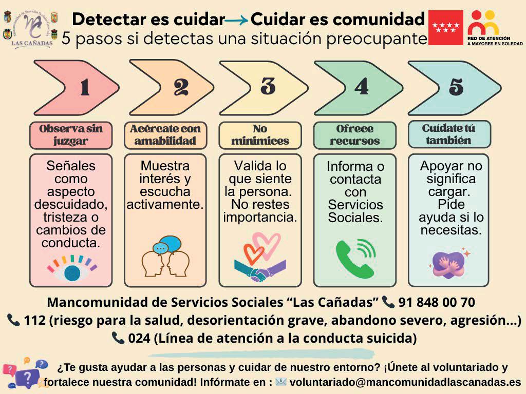 Con el lema “Detectar es cuidar → Cuidar es comunidad”, el objetivo es sensibilizar a la ciudadanía sobre la importancia de identificar posibles situaciones de vulnerabilidad en su entorno (especialmente en personas mayores, solas o en riesgo social) y fomentar una respuesta desde el cuidado, la corresponsabilidad y la cercanía comunitaria.