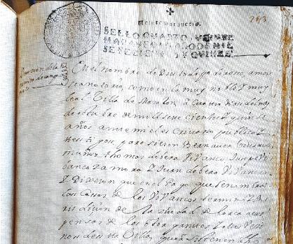 “... en la dicha villa de los Alumbres de Almaçarrón, primer día del mes de Henero, año del nacimiento de Nuestro Salvador Jhesu Christo de mill e quinientos e sesenta e ocho años, ante mi, el escribano, e testigos de yuso escritos, se ajuntaron a cabildo e Ayuntamiento según que los tienen en uso e de costumbre de ser juntar para entender de las cosas utiles e necesarias a la dicha villa, e cumpliendo lo que su majestad manda, conviene a saber, lo que en el dicho Ayuntamiento se hizo e trató e comunicó es lo siguiente: esta villa para siempre servir a Dios e a su majestad, e con animo de que se ensalçe la santa fe católica, an hecho una vandera de tafetán de colores, e se an juntado para yr, como an ydo, a acompañar la vandera susodicha a Nuestra Señora de la Concesión donde se a bendecido he dicho misa. E mandaron a mi, dicho escribano, para que en todo tiempo conste como se cumple lo que su magestat manda e ordena, por su mandamiento el Señor Marques de los Velez, que de fee como se ha hecho la dicha vandera e se le