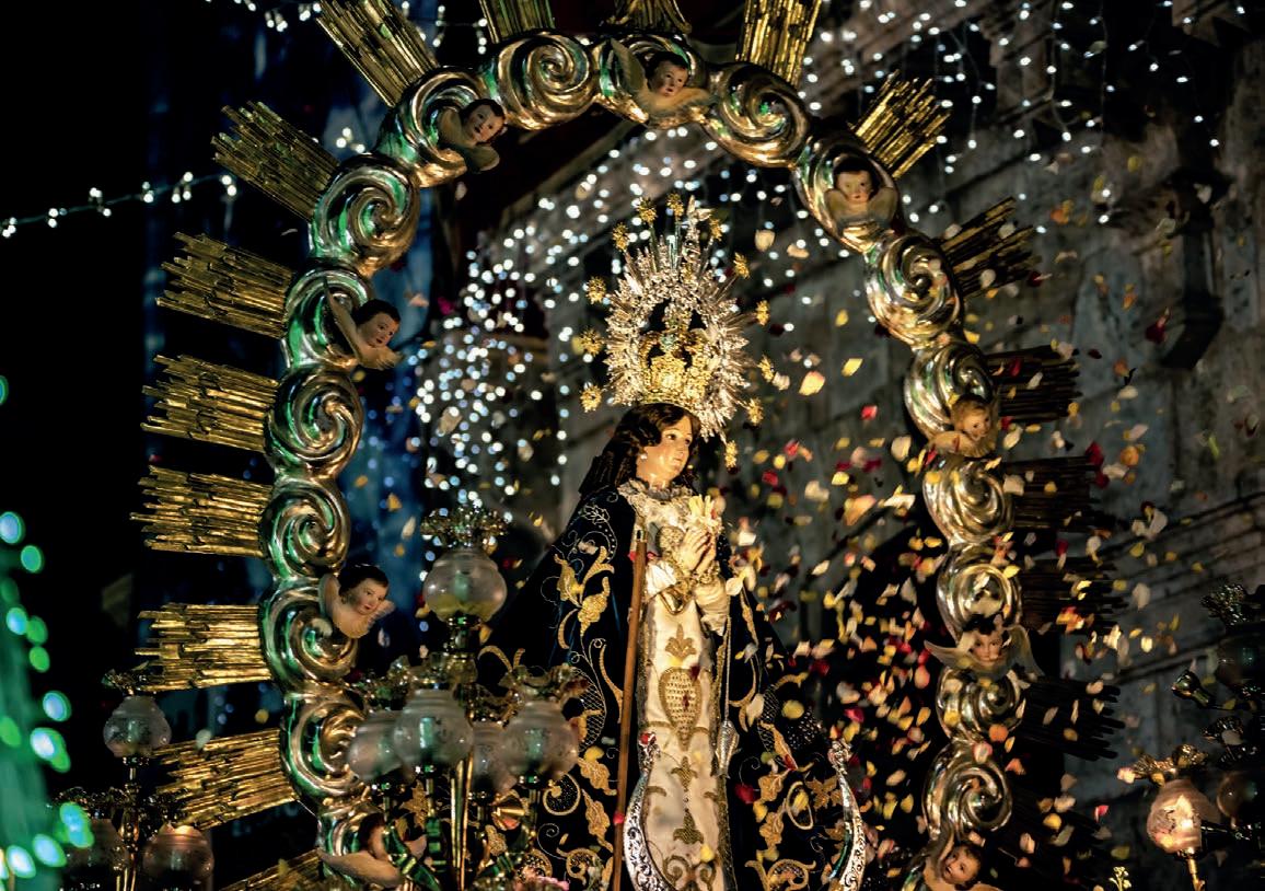 tradicionales carrozas. Con ello, me viene un recuerdo muy bonito de mi infancia en casa, en la que reservábamos la prenda nueva para estrenar ese día en familia, tradiciones que a muchos de vosotros y vosotras os resultarán familiares. Así como el día que considero que vivimos con emoción especial y que se caracteriza por ser nuestro evento central: el día de nuestra querida Patrona, la Purísima Concepción. Salimos a su encuentro para acompañarla y entre silencios compartir con ella pensamientos y deseos, mientras miramos su cara a la salida de su Convento, sintiendo a los que ya no están físicamente, recordando que somos lo que somos gracias a ellos y a ellas.