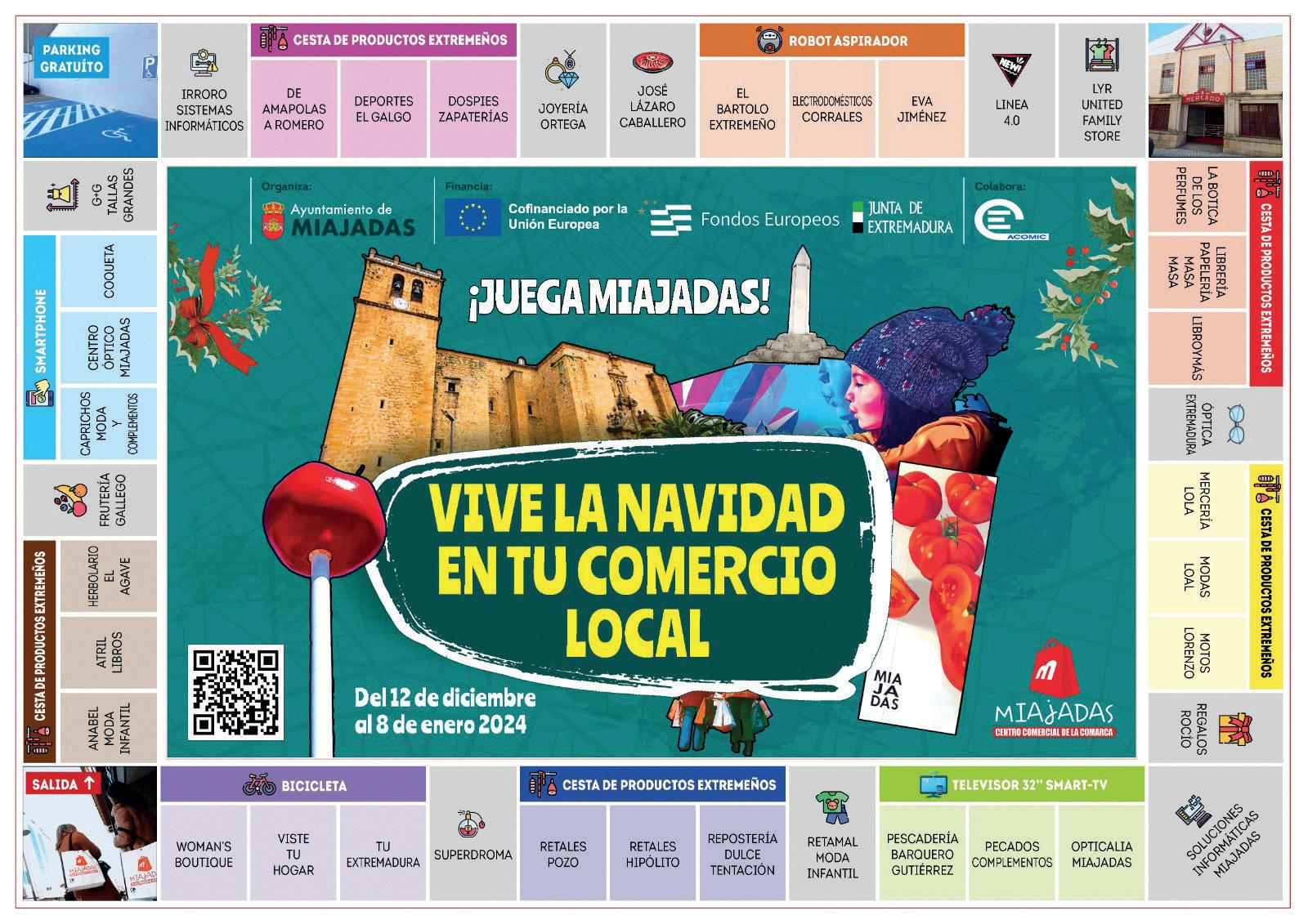Desde el 12 de diciembre hasta el 8 de enero, los comercios participantes repartirán rascas navideños, hasta agotar existencias, a los clientes que efectúen compras superiores a 10 €. Como si se tratará del popular juego del Monopoly, para esta Navidad, la Concejalía de Comercio ha diseñado un tablero con 39 comercios del municipio; los clientes que, del 12 de diciembre al 8 de enero, realicen compras por valor de más de 10 euros conseguirán las tarjetas de ‘rasca y gana’ para lograr múltiples premios. Estos rascas darán opción a conseguir premios directos en los propios establecimientos y premios especiales para aquellos clientes que obtengan las tarjetas con las combinaciones correctas de tres comercios del mismo color, según este tablero: Los premios especiales otorgados por el Ayuntamiento de Miajadas son: 5 Cestas de productos extremeños, 1 Smartphone, 1 Televisor de 32”, 1 Robot aspirador y 1 Bicicleta. Esta Navidad, ¡Juega Miajadas!