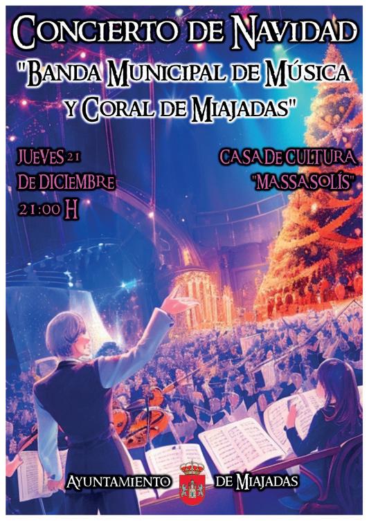 A las 21:00 horas, EN LA CASA DE CULTURA ‘MASSA SOLÍS’, CONCIERTO DE NAVIDAD DE LA BANDA MUNICIPAL DE MÚSICA DE MIAJADAS, acompañada por la CORAL DE MIAJADAS.
