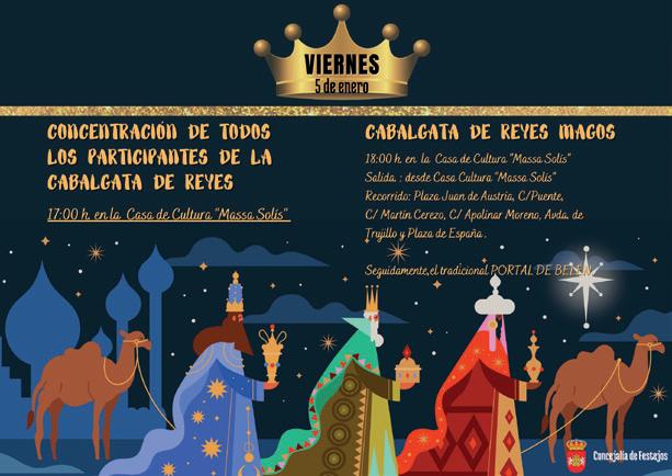 A las 18:00 horas, DESDE LA CASA DE CULTURA ‘MASSA SOLÍS’, CABALGATA DE REYES. Recorrido: pl. Juan de Austria, c. Puente, c. Martín Cerezo, c. Cervantes, c. Apolinar Moreno, av. de Trujillo y pl. de España, donde se ubicará el PORTAL DE BELÉN