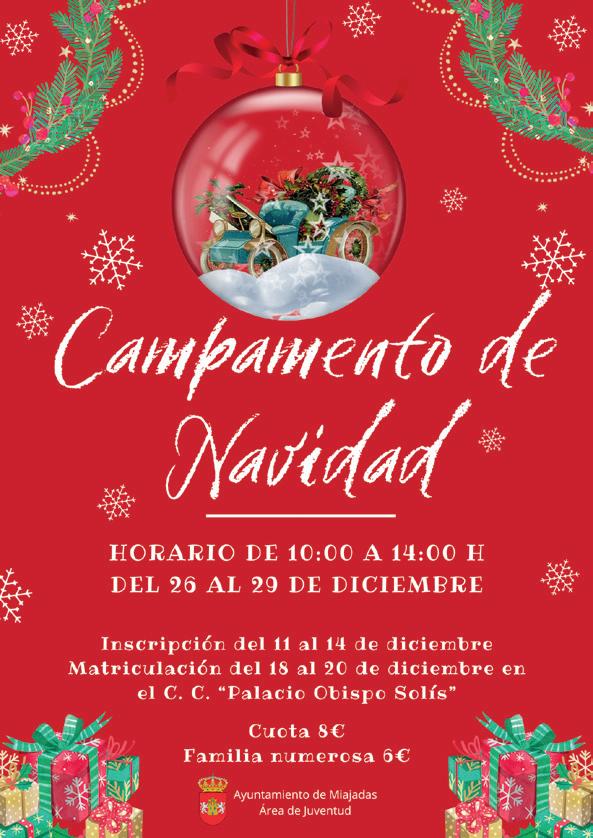 De 10:00 horas a 14:00 horas, CAMPAMENTO URBANO MUNICIPAL DE NAVIDAD Dirigido a niños de 4 a 11 años. Información e Inscripciones: del 11 al 14 diciembre, de 10:00 h a 14:00 h en el Complejo Cultural ‘Palacio Obispo Solís’. Publicación de admitidos: 15 de diciembre. Matriculación y pago: del 18 al 20 de diciembre.