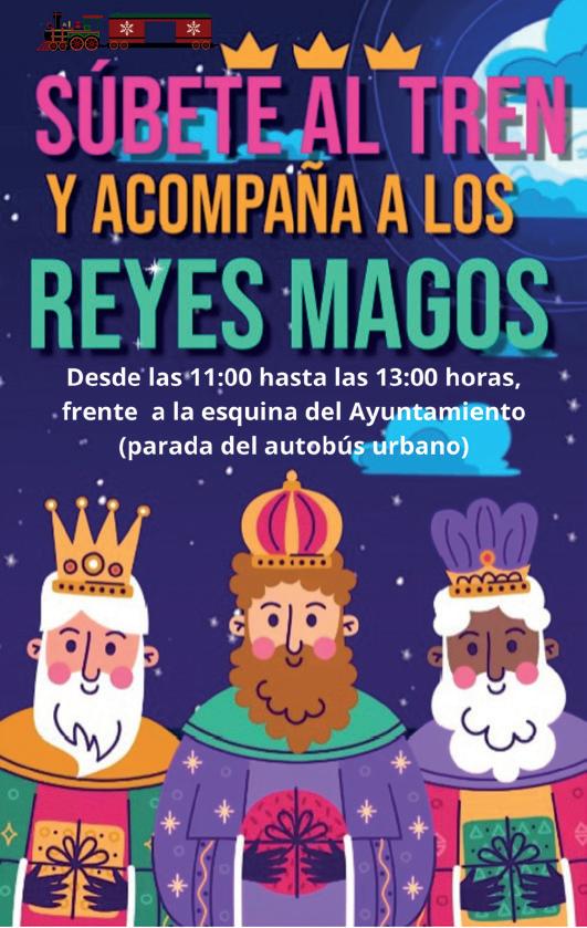 De 11:00 horas a 13:00 horas, FRENTE A LA ESQUINA DEL AYUNTAMIENTO (parada del autobús urbano), ‘¡SÚBETE AL TREN Y ACOMPAÑA A LOS REYES MAGOS!’. Para todo tipo de público.