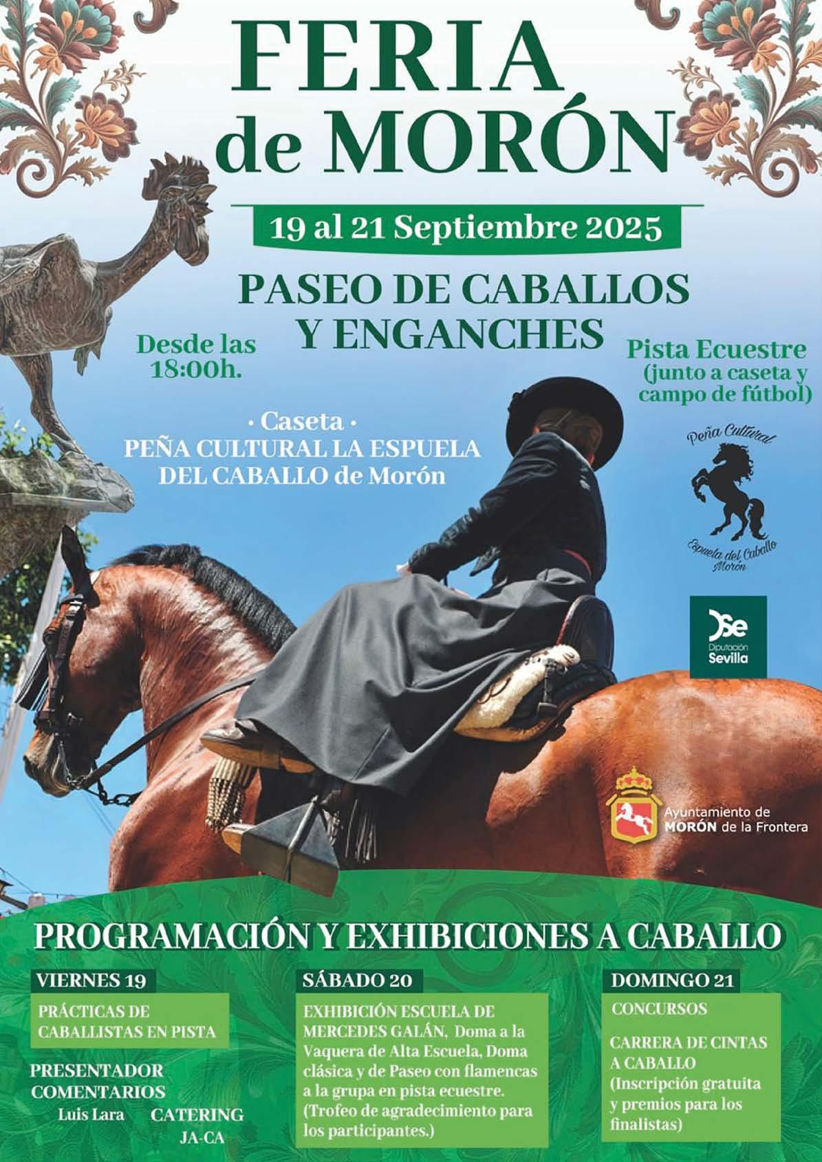 Un año más, la Feria de Morón volverá a brillar con la música en directo para todos los públicos en la Caseta Municipal; el tradicional pasacalles de nuestra Banda Municipal de Música, que coincide con el encendido del alumbrado; la tradicional Diana, los espectáculos ecuestres y los paseos a caballo. Tampoco faltará la zona de atracciones, que seguirá siendo, sin duda, el espacio favorito de los más pequeños… ¡y no tan pequeños!