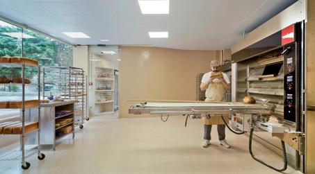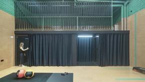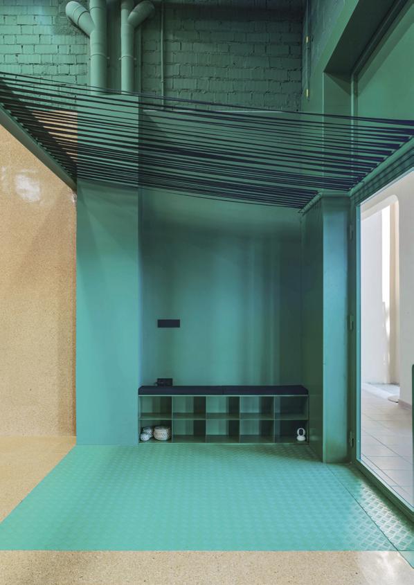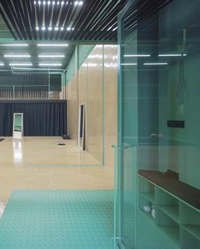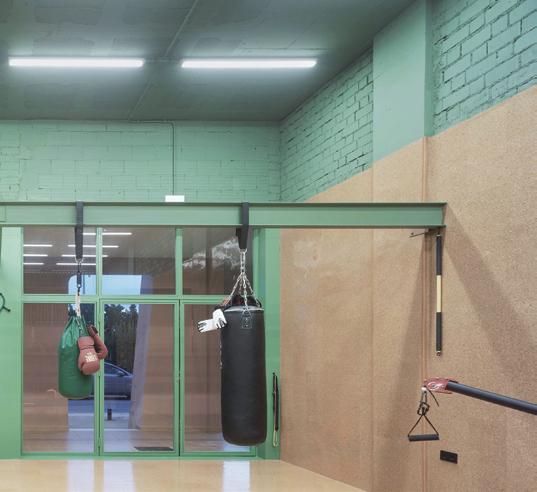 dar a la limpieza que respondía a las preocupaciones de la cliente respecto al envejecimiento de la intervención. En los baños combinamos un azulejo simple con una junta de color rosa, ambas cabinas con el mismo tratamiento, inclusivos, sin espejos y con los mínimos accesorios posibles. Para propiciar la concentración buscamos texturas sutiles, un color, y un poco de vegetación, pocos materiales que ayudaran a crear limpieza visual. La chapa ondulada blanca del interior pasó a forrar la fachada marcando, pero acompañando, el nuevo uso que se añadía al edificio existente de viviendas. La imagen corporativa de academia continuó con los colores interiores y el ritmo de franjas verticales de la chapa ondulada. Crear mucho con muy poco.