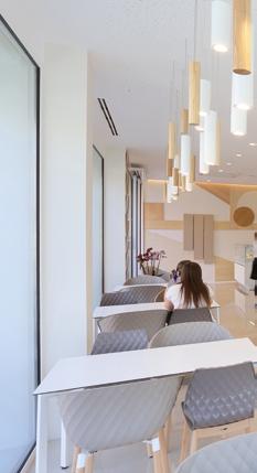 Las curvas nos ayudaron también a crear la división principal y a suavizar la rigidez del espacio, y las presentes tensiones que provocaban los pilares centrales de la sala. El resto se resolvió con materiales sencillos en una armonía matemática. Utilizamos chapa ondulada blanca en la división interior para marcar la ubicación de las aulas. El rosa fue el color usado para las formas libres de las mesas, su contraste con el blanco nos ayudaba a leer mejor el espacio. Unas plataneras vigilan cada espacio porque el verde relaja la mente. Creamos un zócalo de gotelé de pintura satinada por todas las estancias para ayu-