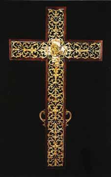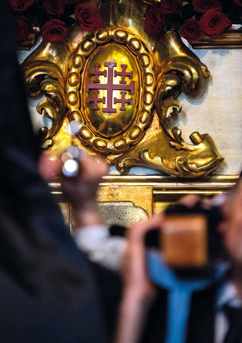 La Cruz nos dirige la mirada hacia los acólitos como guardianes de todo lo que está ocurriendo. Las líneas del suelo ajedrezado nos llevan hasta el Lignum Crucis, rodeada de incienso, que parece querer unir lo terrenal con lo divino.