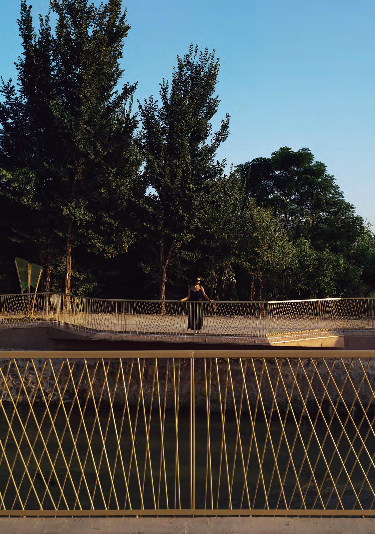 El diseño de la pasarela y las barandillas de acero, tienen como origen los vallados tradicionales de entramados de cañas de los huertos (bardiza), reinterpretando este sistema con geometrías contemporáneas y materiales duraderos adaptados a su uso.