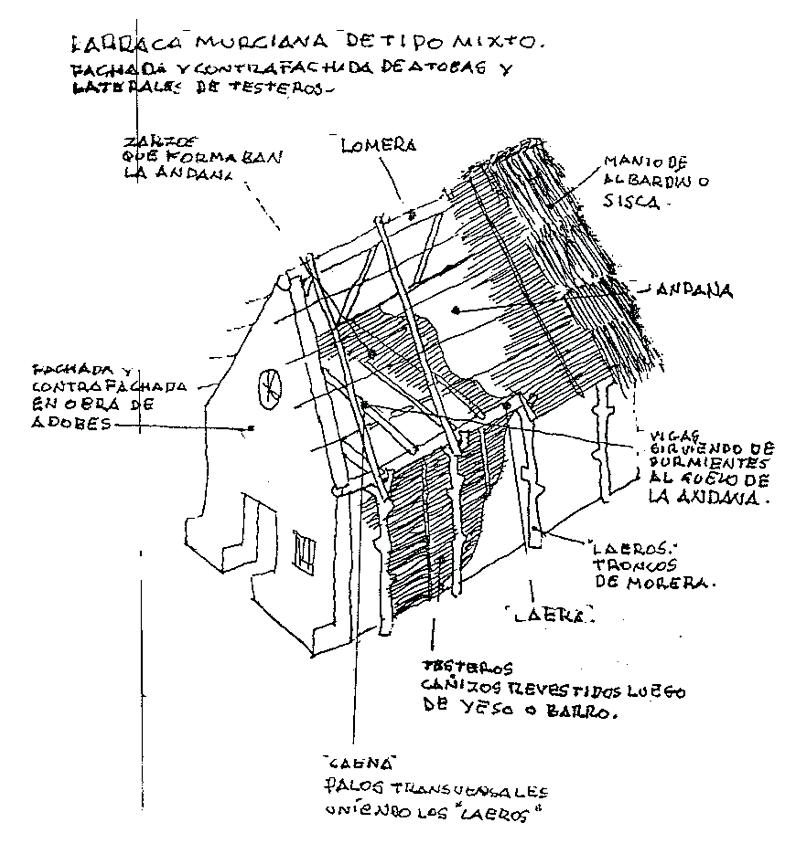 En el año 1878 el arquitecto D. José Marín Baldo, describía la Barraca murciana como “…un nido como el de las golondrinas, que se fabrica con barro y cañas y yerbas secas, por los mismos que han de habitar en ella…” [Imagen 1].