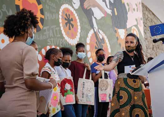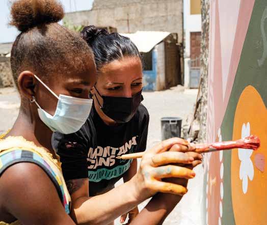 Fui convidada pela delegação da União Europeia, em Cabo Verde, para criar um projeto num bairro na cidade da Praia: pintar um mural e, paralelamente, criar uma série de workshops com meninas em situação de vulnerabilidade e exclusão social. Esse bairro, apesar de ficar a 5/6 quilómetros do centro, é completamente ostracizado. Os cabo-verdianos não entram e eu estive lá um mês a pintar. A arte urbana é uma ferramenta poderosíssima para criar ligações com as pessoas, para comunicarmos sem diferenças. Como é uma ferramenta leve, uma atividade lúdica serve para abordar questões e valores que, no meu entendimento, são extremamente importantes e estão cada vez mais em risco de colapso na contemporaneidade.