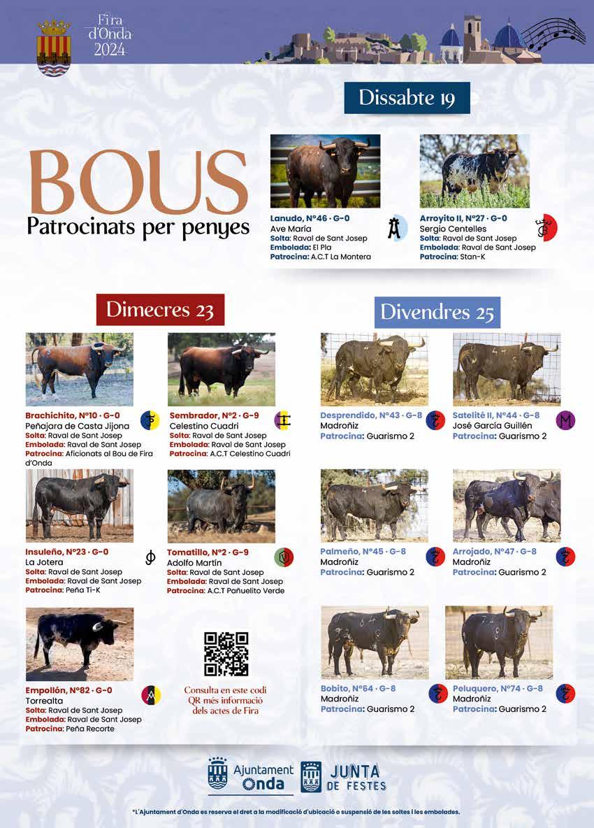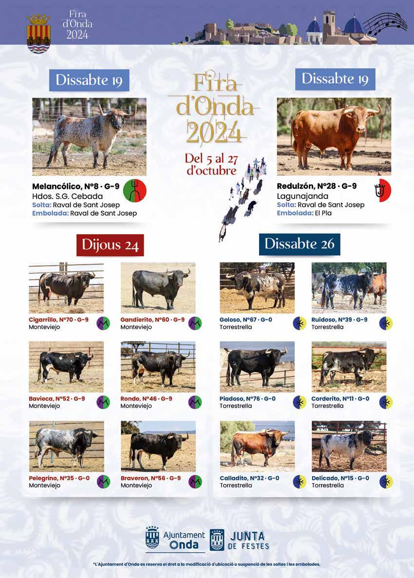 ramaderies espanyoles exhibiran els seus bous als carrers de la vostra localitat i els grans retalladors lluiran les seues millors habilitats. Milers de visitants s’acostaran al reclam del que oferix el cartell taurí, un cartell de gran qualitat que posarà a Onda i Castelló en el punt de mira.