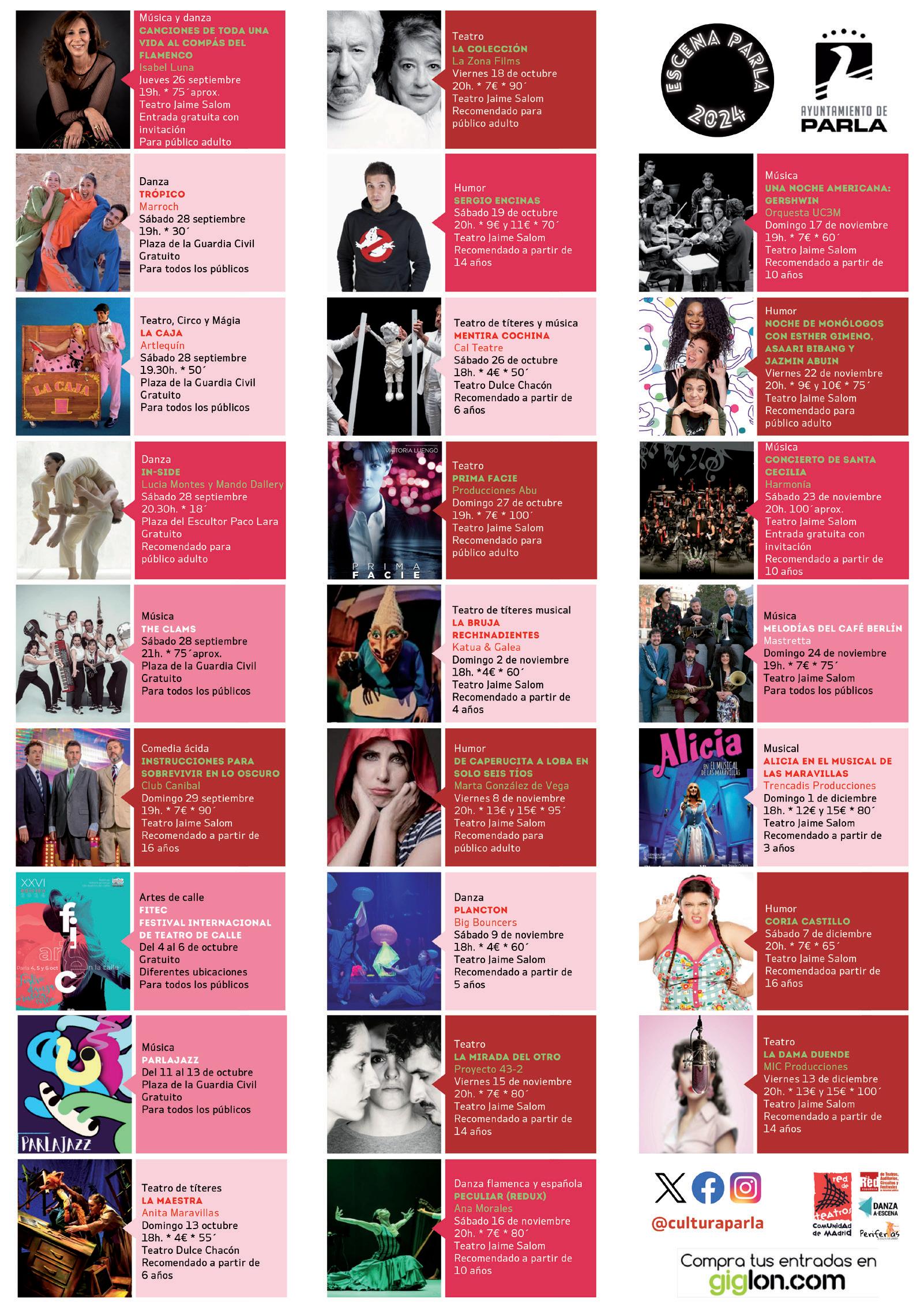 20:00h. Actuación de los grupos de baile de las siguientes asociaciones de Parla: CASA MADRID, CASA DE ANDALUCÍA, A.VV. LA GRANJA, A.VV. BARRIO 2001, CLUB COMPASS, ASOC. MUJERES DE CABO VERDE, ASOC. RUMIÑAHUI, TABLAO Y TUMBAO, VUELO 738 DESTINO COREA, ACRÓPOLIS 96, A.VV. PARLA ESTE.