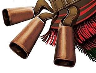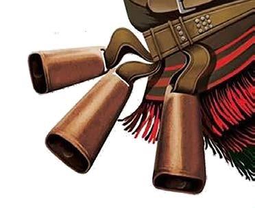 À cintura, um cinto de couro coberto de chocalhos e no peito duas fitas, também elas de couro, servem de adorno aos fatos, juntamente com o pau/vara que estas “criaturas” transportam nas mãos.