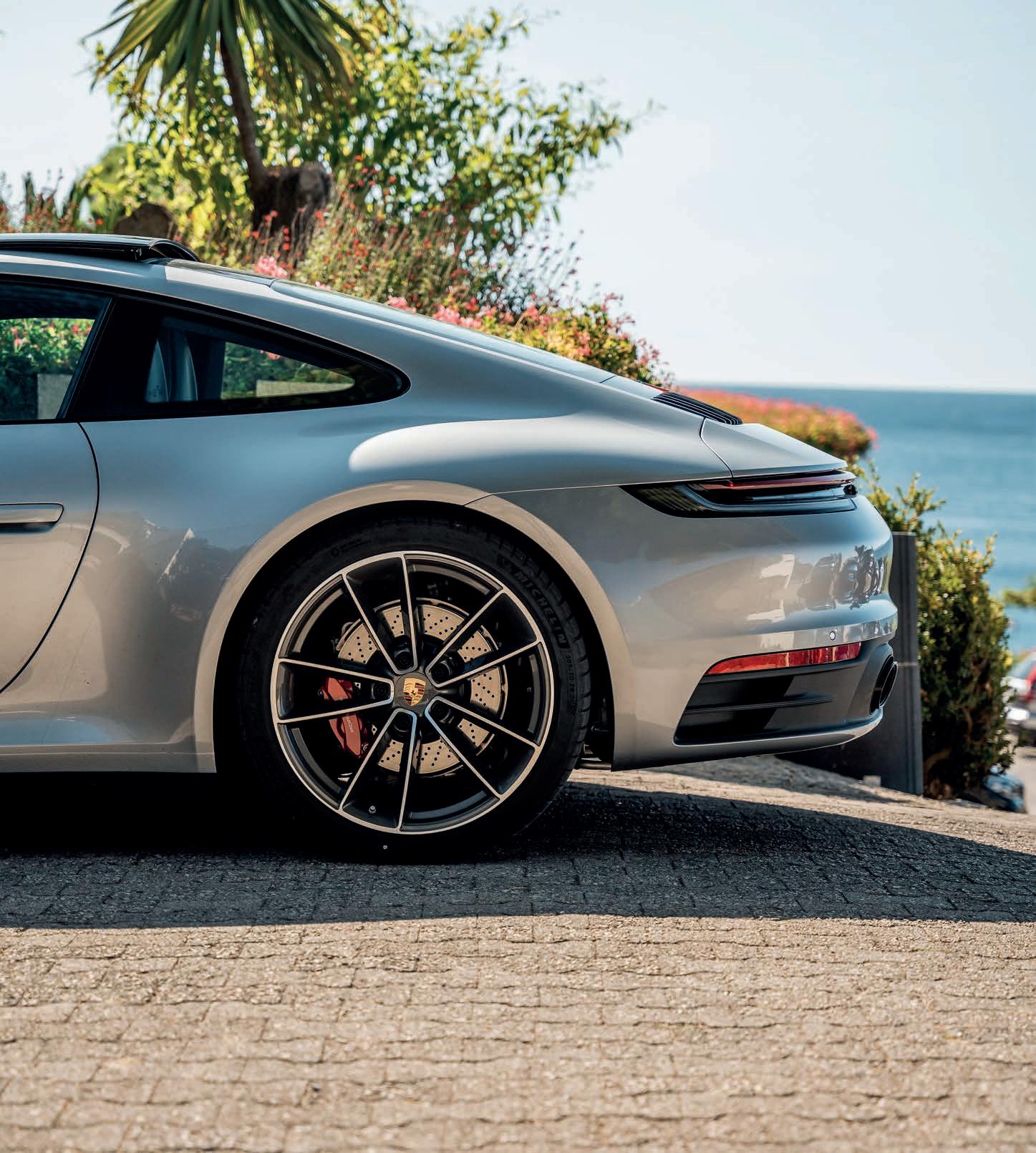 El sistema de escape deportivo con salidas en negro es de serie. También forma parte del equipamiento estándar la suspensión deportiva Porsche Active Suspension Management (PASM), que es 10 milímetros más baja, el sistema de elevación del eje delantero y los faros Matrix LED con Porsche Dynamic Light System Plus. Los frenos carbonocerámicos PCCB son de serie y las pinzas están pintadas de negro.