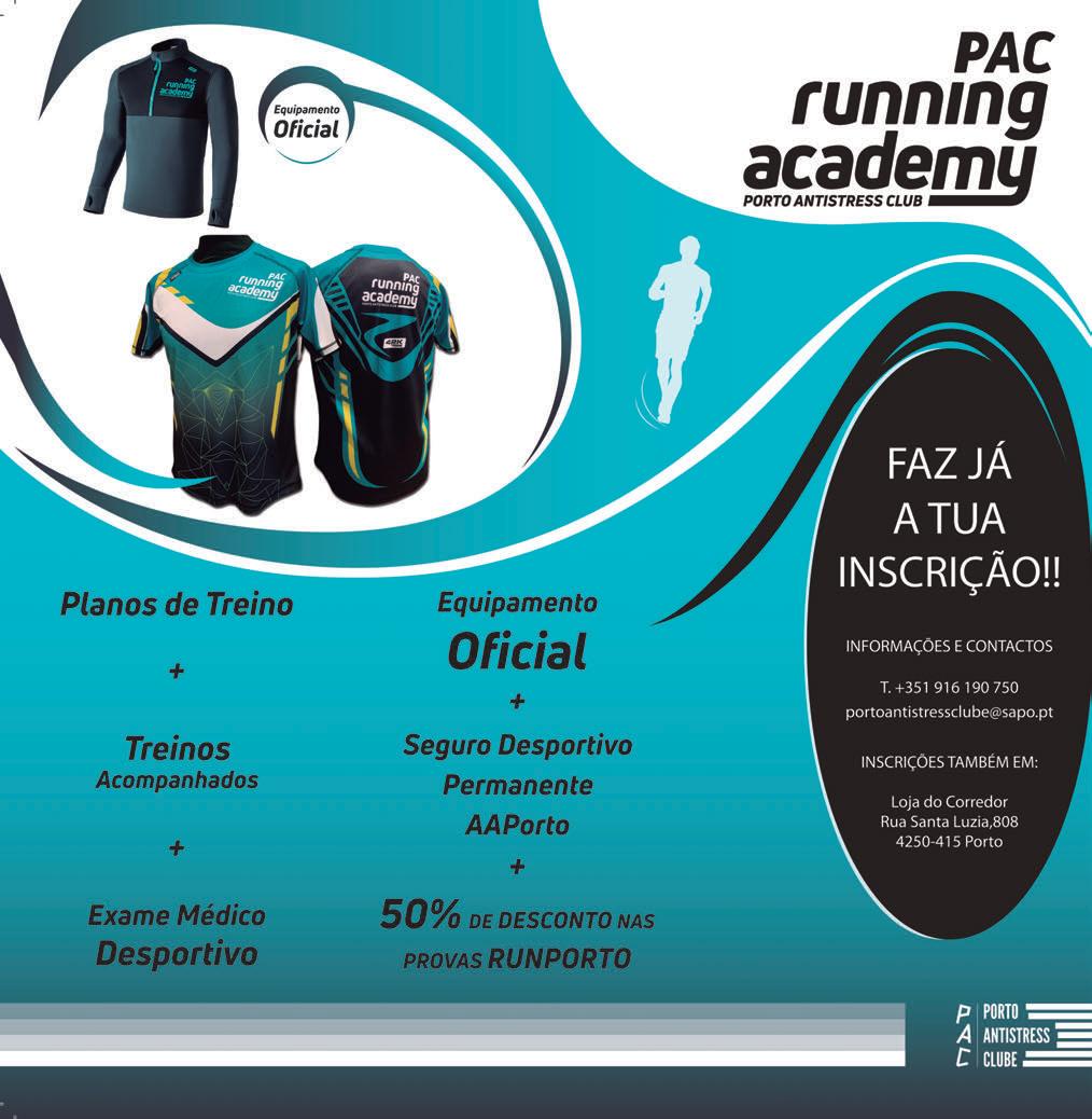 O Porto Antistress Clube - PAC Running Academy oferece-te vantagens tais como: acompanhamento profissional; planos de treino especializados de preparação para provas; consulta médico desportiva; seguro da Associação de Atletismo do Porto; 50% de desconto em todas as provas da Runporto (incluindo Maratona do Porto e Meia Maratona do Porto); e, ainda, um excelente equipamento oficial do clube.