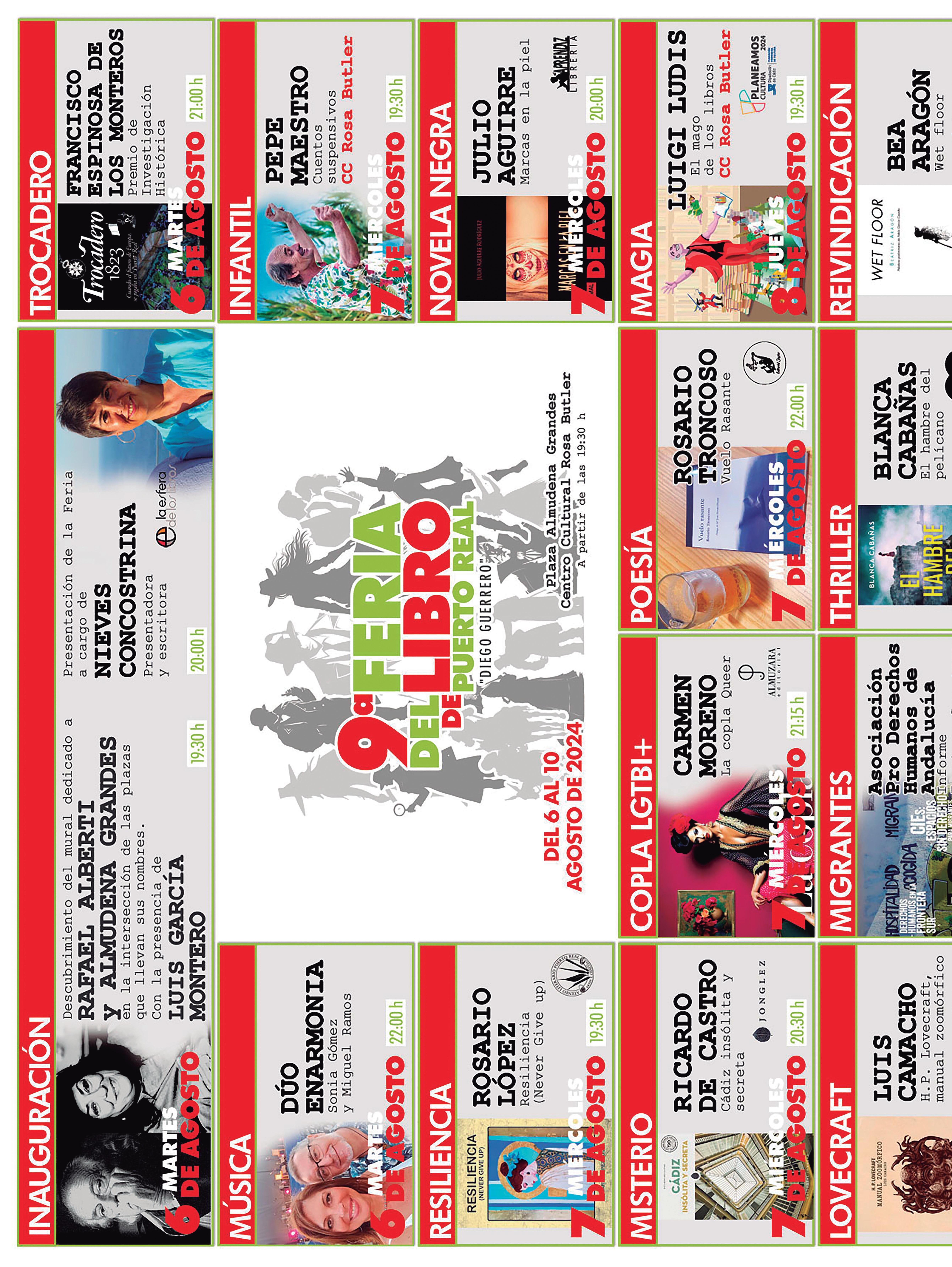 22:00 h: Presentación del poemario “Vuelo rasante”, por ROSARIO TRONCOSO. Acompañada por Carlos Jaime Sarria al violín. Una nueva obra que sumar a la larga trayectoria de esta prolífica escritora. Presentada por Aurora Salvador Colorado, alcaldesa de Puerto Real.