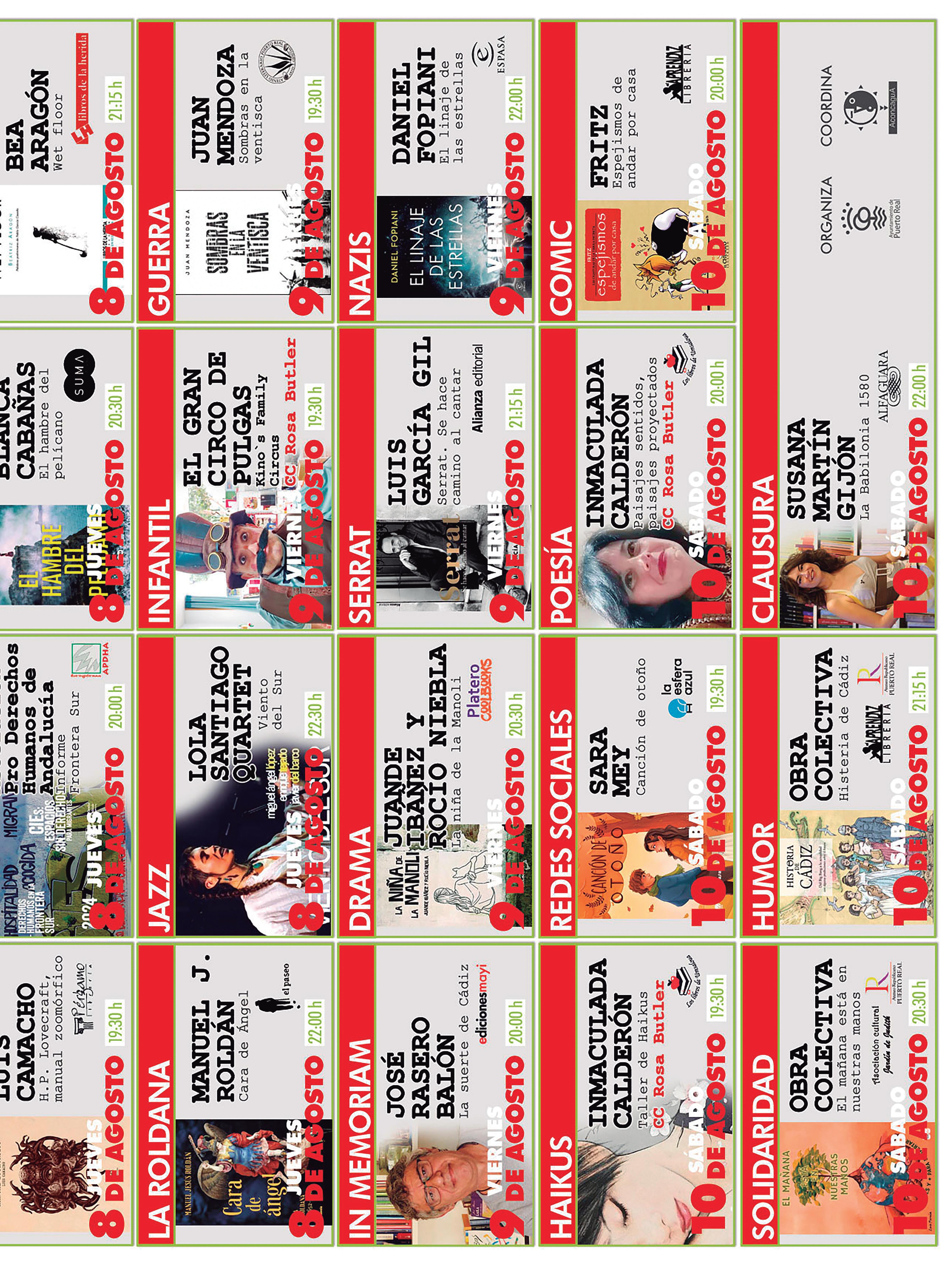 NARRATIVA: JULIO AGUIRRE (miércoles 7, 20:00 h); BLANCA CABAÑAS (jueves 8, 20:30 h); MANUEL JESÚS ROLDÁN (jueves 8, 22:00 h); JUAN MENDOZA (viernes 9, 19:30 h); JUANDE IBÁÑEZ y ROCÍO NIEBLA (viernes 9 de agosto, 20:30 h); DANIEL FOPIANI (viernes 9, 22:00 h); SARA MEY (sábado 10, 19:30 h).