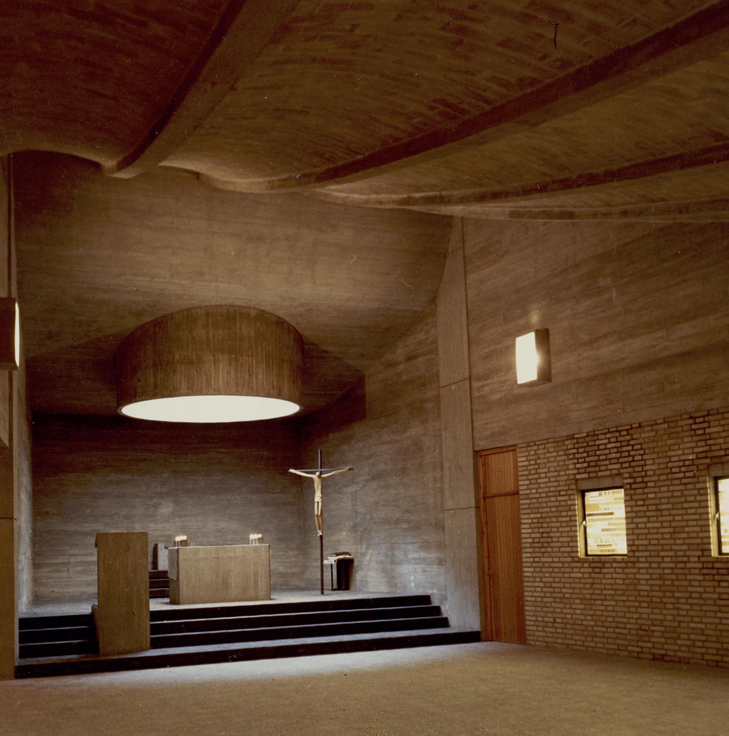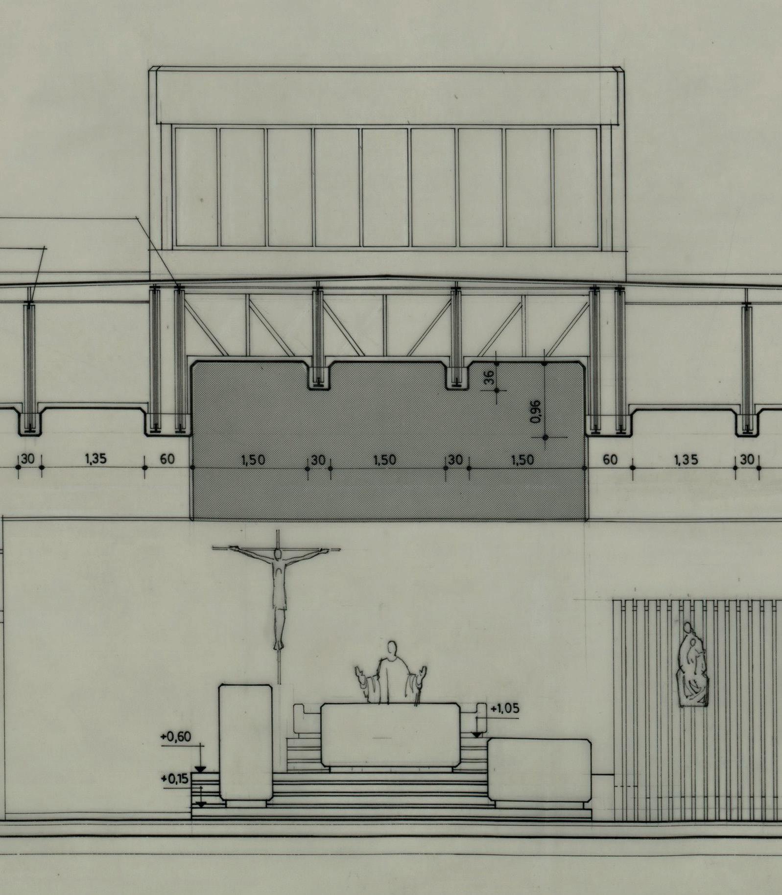 cabecera se aloja el misterio del cuerpo de cristo. Una pequeña luces refuerza ese punto local, y ayuda. La llama permanente y su simbolismo. Los muros laterales de la nave convergen hacia la cabecera, reforzando, más si cabe, la focalización del espacio y concentrando la atención de cualquier observador en la actuación del presidente. El lenguaje de esta arquitectura es claro y sincero, como el de su autor, lo que vemos nos enseña con claridad cómo se construyó y cada material ha sido elegido cuidadosamente para la función que se le encomienda. En ese sentido es un clásico, también lo es por el orden introducido. Por el manejo desenvuelto de los volúmenes, sus maclas, y el empleo de la planta libre, renunciando a la academia, es un moderno. Y el conjunto de este mestizaje clásico-moderno, queda resuelto por las referencias al lugar y el rigor del proyectista. Nos va a resultar que estamos ante un librepensador riguroso.