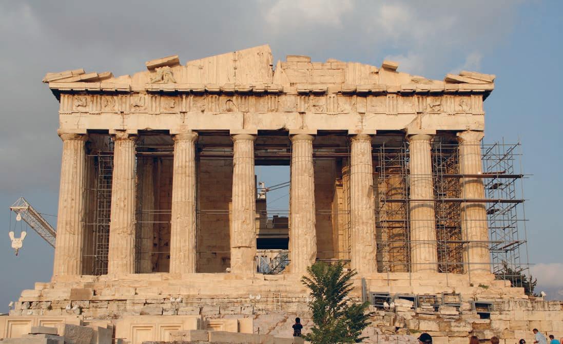 ↑ Vista frontal del Parteon en la Acrópolis de Atenas.