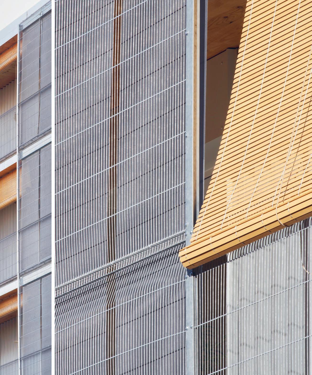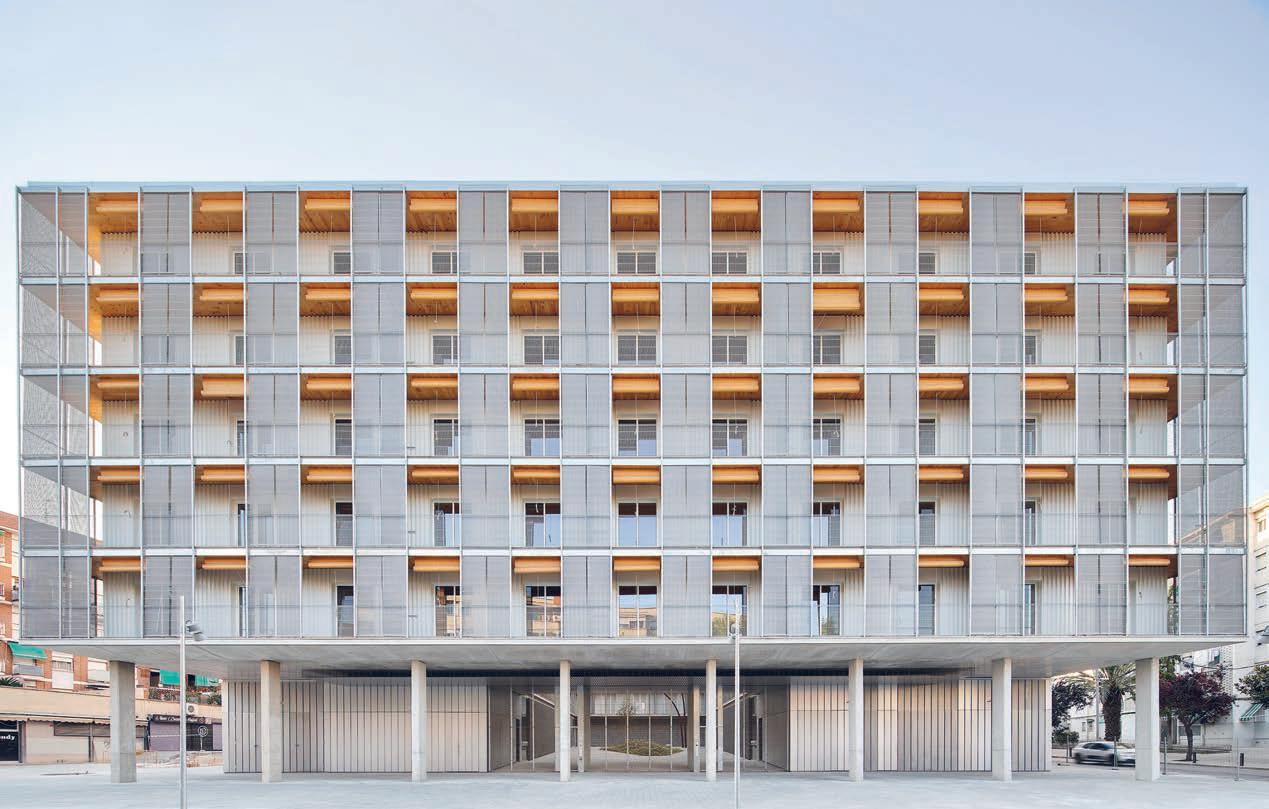Las 85 viviendas sociales de Cornellà se distribuyen en cinco plantas con estructura de madera, apoyadas sobre una planta baja con estructura de hormigón armado, que responde al uso comercial y de equipamiento público.