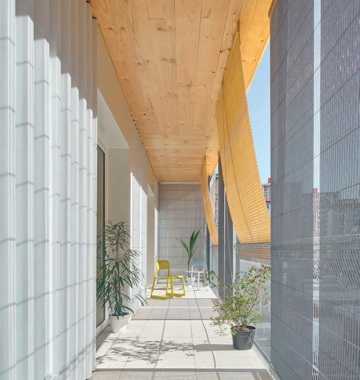 Las terrazas perimetrales de la corona exterior son umbráculos con protecciones solares y filtros de intimidad que junto con la ventilación cruzada reducen la demanda energética en verano.