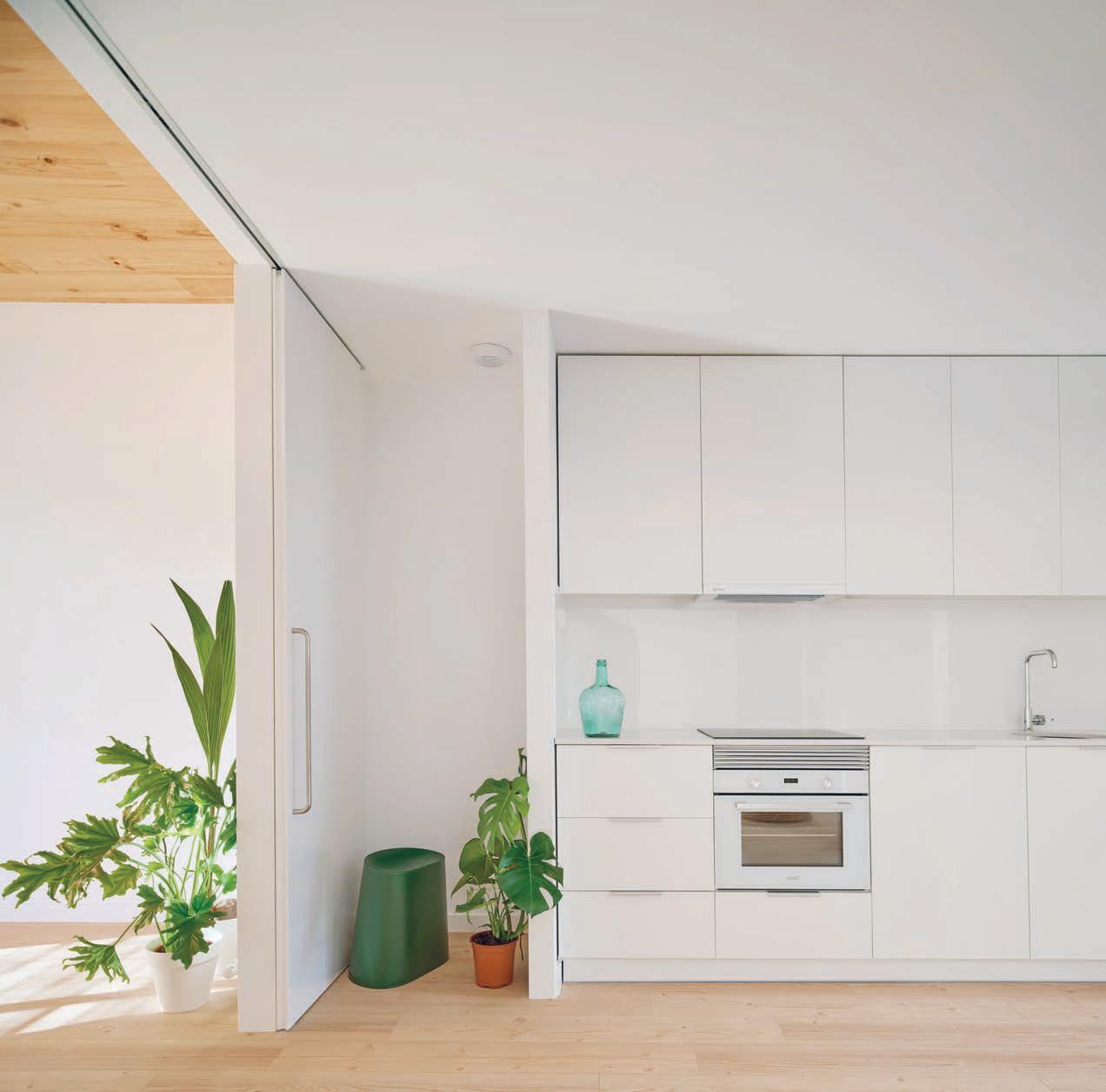 La cocina, abierta e inclusiva, se sitúa en la habitación central y es la pieza distribuidora que sustituye a los pasillos, a la vez que permite visibilizar el trabajo doméstico y evitar roles de género.