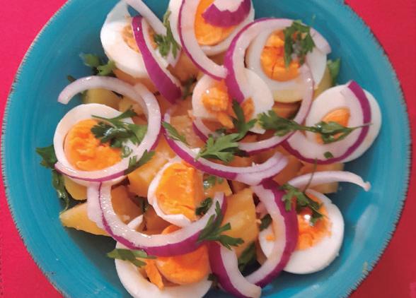 Preparamos un cuenco y echamos las patatas en trozos, los huevos cocidos en rodajas, y la cebolla morada en aros finos, por último, hacemos el aliño.