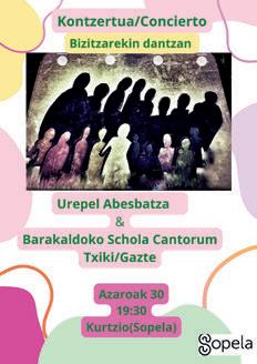 Antolatutako programazioa ixteko, Urepel Abesbatzak eta Schola Cantorum kontzertu bat eskainiko dute Kurtzio Kultur Etxean 20:00etatik aurrera.