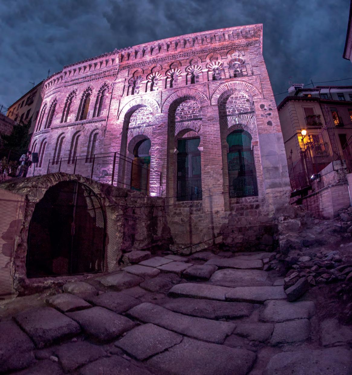Cerco de la Judería: Te invitamos a descubrir la cerca medieval de la antigua Judería Toledana a través de proyecciones de luz que limitan contornos, recordando de forma simbólica los principales accesos, puertas y muros que la conformaban. Esta iluminación que se complementa con unas placas de hierro en estos puntos, indican al visitante durante el paseo diurno, el trazado de la cerca judía.