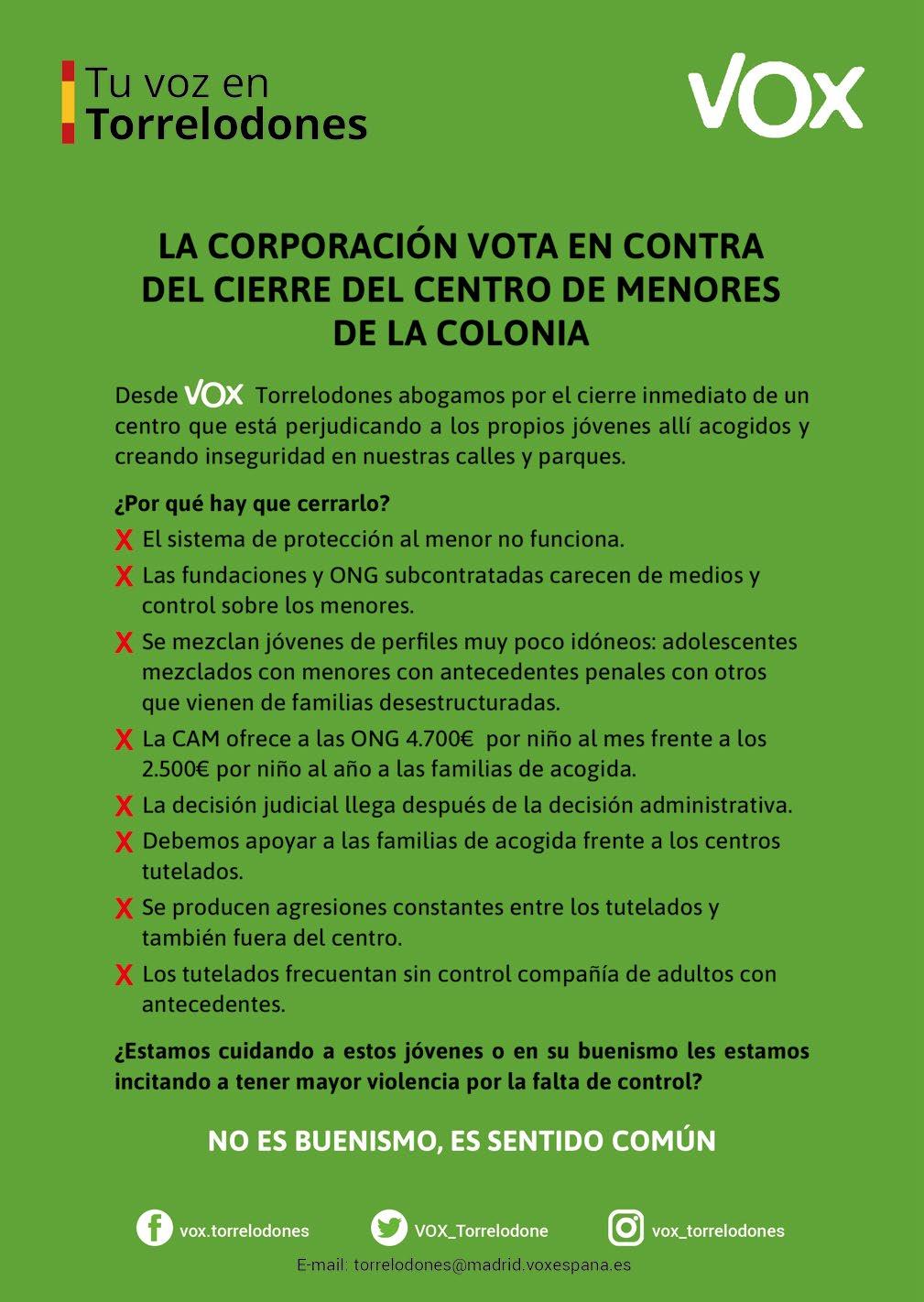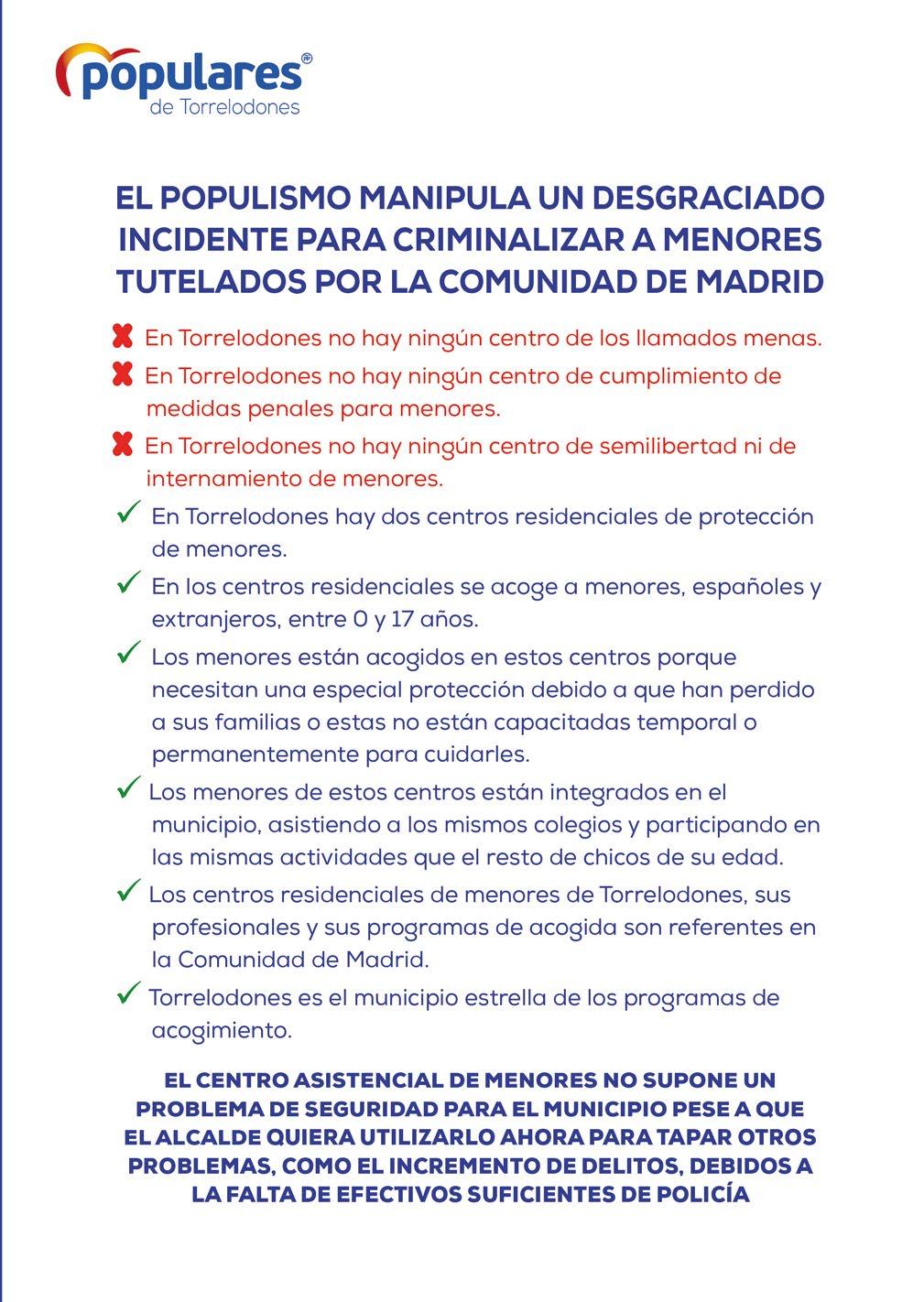 Ante la inacción de la Comunidad de Madrid no podemos esperar más y debemos seguir adelante en la búsqueda de soluciones para que la vida de la que los torresanos disfrutamos no se vea alterada, ni siquiera puntualmente. Defendemos el derecho de los menores más vulnerables a tener un futuro mejor, al igual que defendemos el derecho de los menores a disfrutar con seguridad de su entorno. Por último, quiero aprovechar la ocasión para reiterar todo mi apoyo y solidaridad tanto con los jóvenes agredidos como con sus padres, algo que ya hice personalmente, como no puede ser de otra forma. Yo soy padre de cinco hijos y entiendo perfectamente su indignación, su desasosiego y su preocupación.