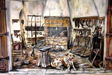 Recreación antigua herrería tradicional: ubicado en el Callejón del Candil, junto a la importante C/ Santa María, corazón comercial del Centro Histórico de Utiel. La escena representa una antigua herrería en el lugar donde se encontraba el antiguo gremio de hojalateros de Utiel. Fue realizado por Javier Cerezade de Murales Valencia Pintura Mural en 2018.