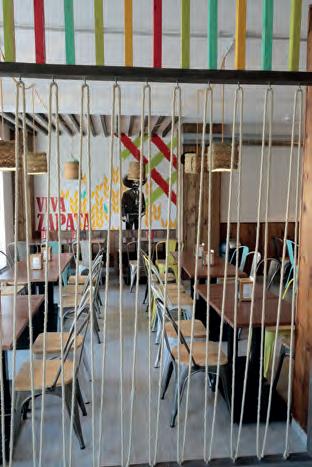 tones de las celosías, sobre los zócalos de madera y en los asientos. Esta combina armónicamente con el resto de acabados del local, maderas, cuerdas de rafia y el esparto de las lámparas que con su textura natural nos conectan con la Revolución Mexicana.