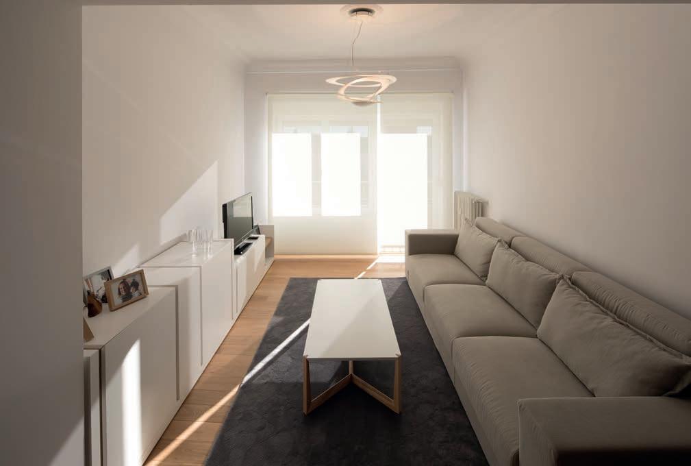 Este espacio continúa hacia la fachada y es donde se ubica la zona de estar, presidida por un cómodo sofá. El mobiliario tanto de la cocina como de esta zona se ha escogido en color blanco cuyo diálogo con la madera y la iluminación elegida crea un juego muy a la manera nórdica, especialmente amable.