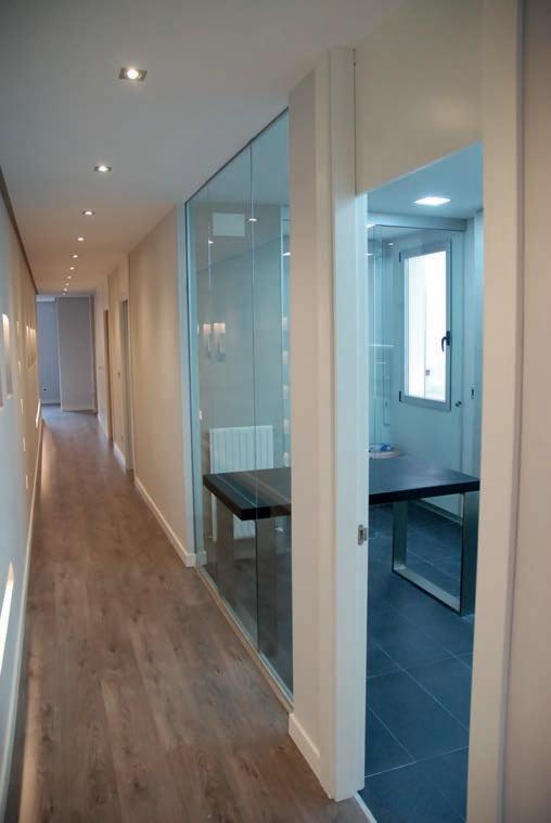 cocina de la planta inferior, y a la vez ver el comedor desde el salón, creando un salón-comedor en dos niveles diferenciados pero unidos a la vez. El suelo de vidrio pisable, además de permitir conservar la superficie útil, se convierte en un elemento lúdico.