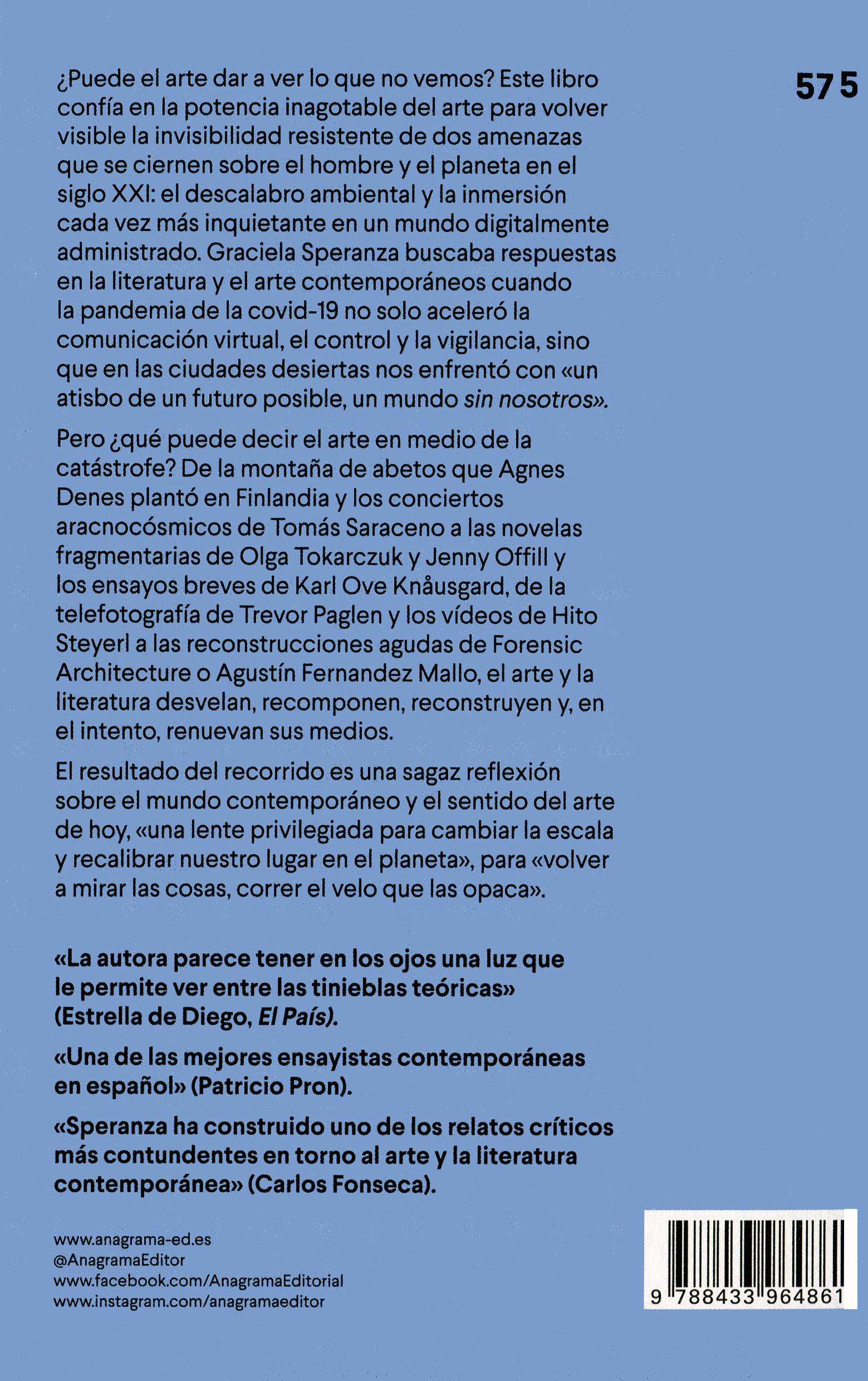 «Allí donde está el peligro», escribió un poeta visionario, «crece también lo que salva.» Eso pensaba en los primeros meses de 2019, mientras escribía unas páginas esperanzadas sobre los once mil abetos blancos que la rumana Agnes Denes plantó en los noventa en una cantera de Finlandia para que dentro de cuatro siglos se convirtieran en un bosque primario, capaz de mitigar los efectos del descalabro climático Era apenas una pieza en una sucesión de otras piezas que se iban encadenando sin un rumbo demasiado jo, guiada por coincidencias, a veces sorprendentes a veces mínimas, como en la línea recta o de pronto quebrada de un dominó. Avanzaba a paso lento pero rme, llevada por el diálogo animado con cada obra, cada relato, cada imagen descubierta o recordada, pero también por la elocuencia casi mágica del montaje que habla en los intervalos. Si algo reunía las piezas o alentaba el avance era una urgencia, un llamado, una lente que desenfocaba casi todo lo demás, buscando atajos para volver visible la invisibilidad resistente de dos amenazas que nublan la imaginación del mañana: la inminencia cada vez más clara de un nal acelerado por el maltrato suicida del planeta y la inmersión cada vez más inquietante en un mundo digitalmente administrado Antes que en las cumbres de estadistas o las voces relegadas de la ciencia, con aba una vez más en la potencia inagotable del arte para correr el velo y dar a ver lo que no se ve. Pero fue precisamente en esos días que sobrevino otra amenaza, más inminente y brutal, y el tiempo encapsulado de la obra de Denes, Tree Mountain A Living Time Capsule, se volvió de pronto incierto, nebuloso, un tembladeral. ¿Cuatro siglos? Ahí donde está el peligro, ¿crece de veras lo que salva? Más delgada que una milésima parte del ancho de una pestaña, la nueva amenaza era impalpable como las otras, pero tenía ahora un nombre propio, incluso dos, que la volvían más discreta, más real: COVID 19/SARS CoV 2. Y aunque era literalmente invisible al ojo desnudo esta vez, fue cobrando con el tiempo formas más arteras de la invisibilidad El encierro y la distancia fueron volviendo irremediablemente invisibles el avance silencioso del virus por las ciudades, el vértigo de las guardias, las unidades de terapia intensiva y las listas de los muertos, muertos solos entre fantasmas cubiertos de máscaras. Las metáforas bélicas vinieron a llenar el vacío, tratando de darle nombre al «enemigo invisible» y aunar