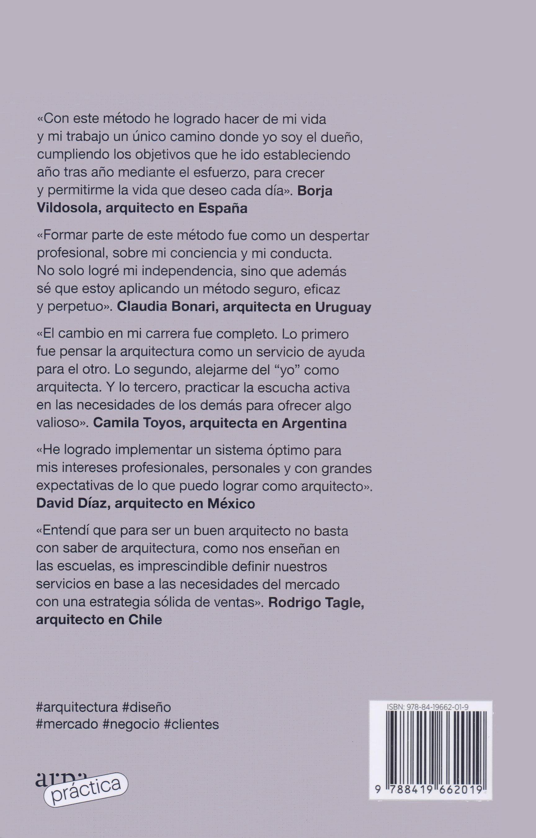 Empezando por la transformación interna del arquitecto sobre su propósito, esta es una guía que paso a paso analiza el mercado actual y te ayuda a descubrir nichos de oportunidad, diseñar una propuesta arquitectónica singular y atractiva que te diferencie, dominar el arte de la venta para conciliar tu faceta creativa con tu faceta empresarial, liderar las relaciones con tus clientes y colaboradores imprimiendo orden al servicio,