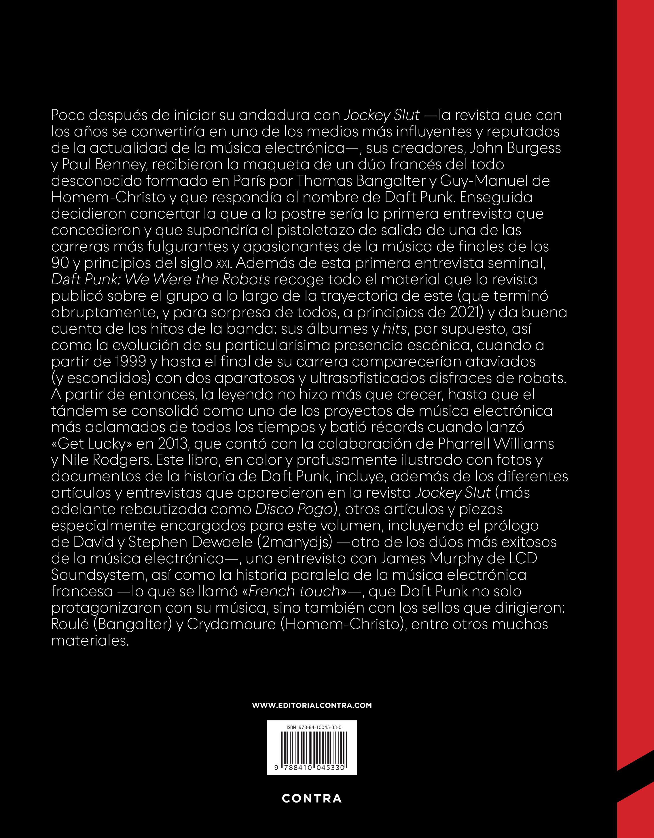Disco Pogo es la nueva encarnación de la revista Jockey Slut, una publicación fundada en Mánchester por John Burgess y Paul Benney que estuvo operativa entre 1993 y 2004, y que alcanzó un estatus de culto en un paisaje mediático dominado por publicaciones más comerciales como DJ Magazine, Muzik o Mixmag. El eslogan de Jockey Slut era «Disco pogo for punks in pumps» (Disco pogo para punks en zapatillas), del cual deriva el nombre de la nueva publicación de carácter bianual lanzada en 2022. Disco Pogo fue también el nombre de las fiestas que Burgess y Benney montaron a partir de 1994, y que un año después se convirtieron en Bugged Out!, una de las marcas más longevas de la música de club del Reino Unido. Daft Punk aparecieron en Jockey Slut en numerosas ocasiones (incluida su primera entrevista), y todas esas piezas originales aparecen en este libro, junto con nuevas entrevistas, ensayos, artículos y una discografía y gigografía (listado de sesiones de DJ y actuaciones en directo) exhaustivas.