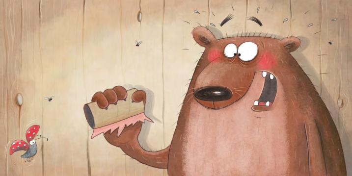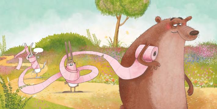 Sin embargo, el señor Oso no ha oído ningún ruido y sigue caminando con el papel al vuelo. Poco después adelanta a dos conejitos, que tienen una gran ocurrencia.